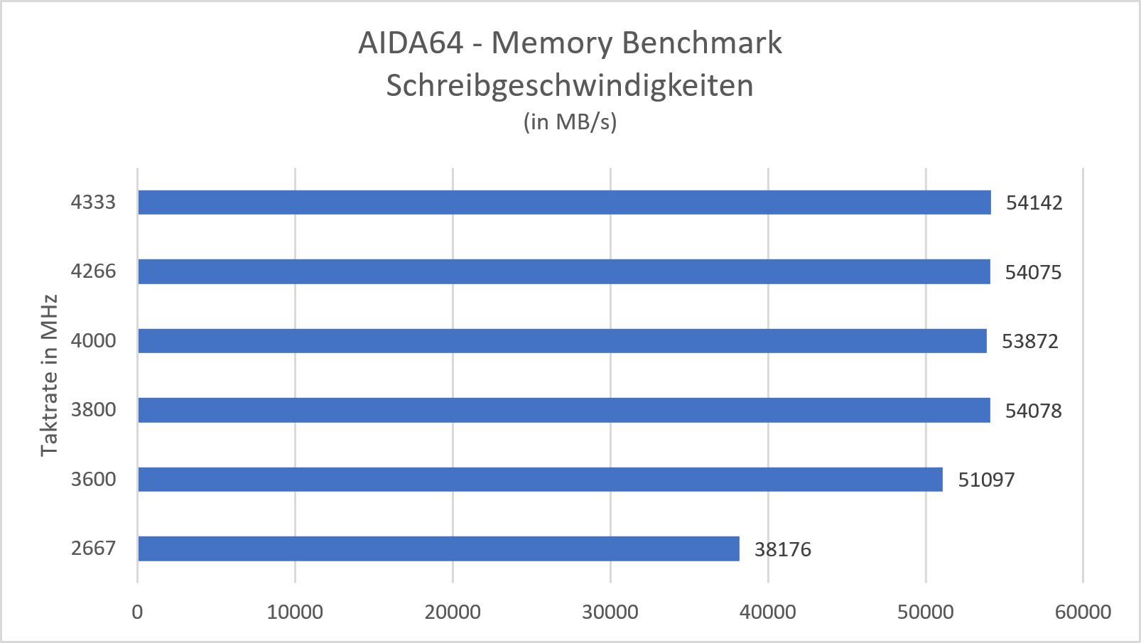 Bei den Schreibgeschwindigkeiten fiel die Differenz nicht ganz so groß aus – so sind es hier im Vergleich von 3600 MHz zu 4333 MHz „nur“ 6 % Steigerung. Im Prinzip lag in diesem Fall die überzeugendste Stufe bei 3800 MHz.
