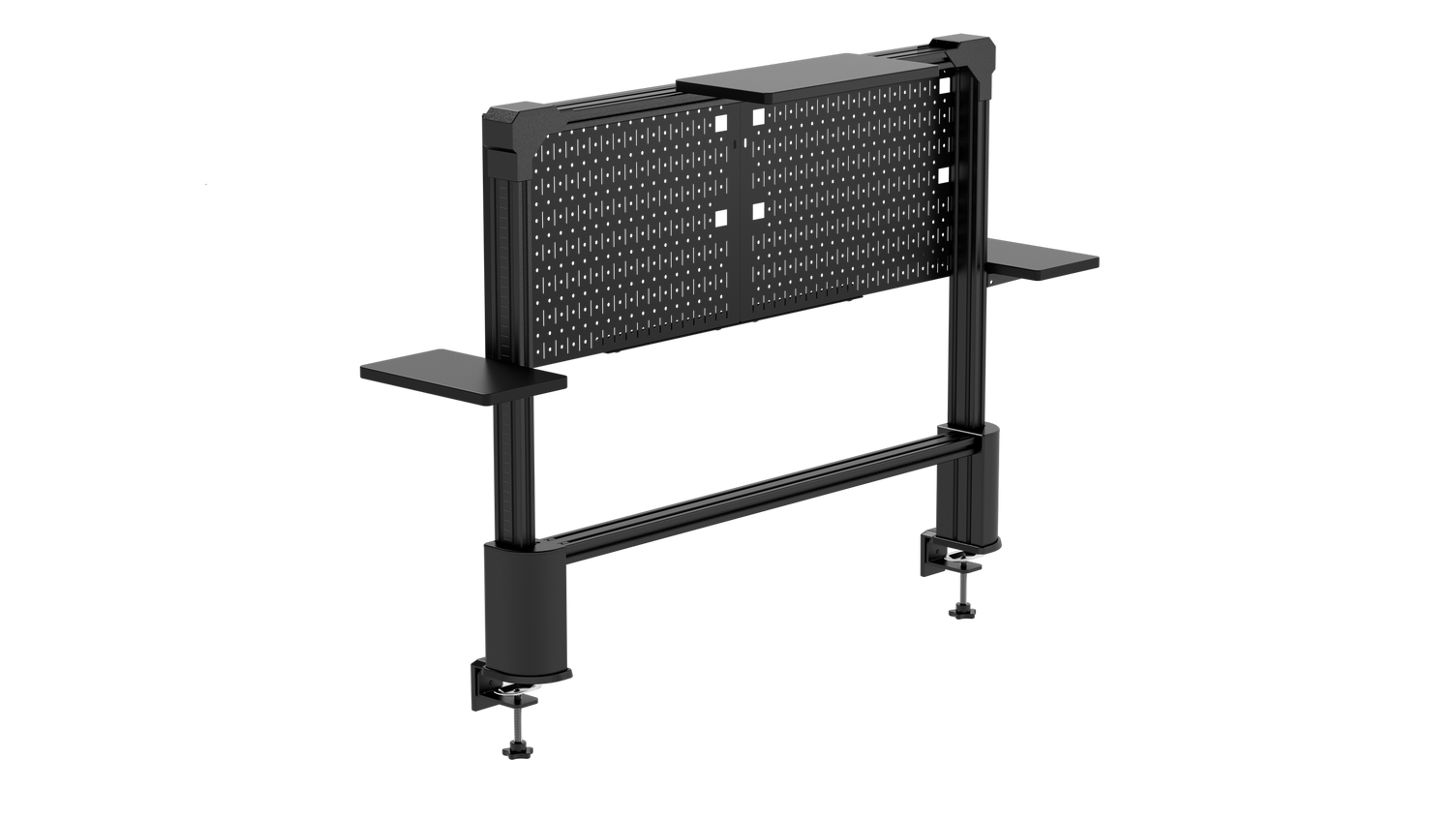 Die Multi Frame-Lochwand verfügt über eine universelle Standard-T-Querstange aus Aluminium 3060, die viele Aftermarket-Zubehörteilen unterstützt. Die mitgelieferten T-Muttern und Adapter ermöglichen die einfache Montage von Elgato-Hardware wie Key Light und Flex Arm bis hin zu 3D-gedruckten Eigenkreationen. Die Schiene ermöglicht zudem die einfache Montage von ein oder zwei VESA-Monitorarmen, um selbst große Monitore nach oben und vom Schreibtisch weg zu bewegen.