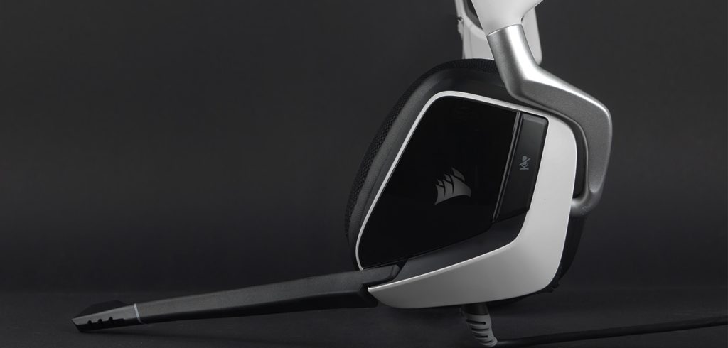 Zu den Seiten hin steckt der Kopfbügel in zwei weißen Kunststoffschuhen, die sich zur Größenverstellung auf einem Raster vom Bügel ziehen lassen. Das Raster ist dabei auf dem schwarzen Bügel im Inneren markiert, sodass man die Größenänderung ablesen kann. Auf dem linken Bügel sitzt ein kleiner grauer Corsair-Schriftzug als einzige Außenbeschriftung des Headsets. Die weißen Kappen verjüngen sich nach unten hin und gehen in die Gelenke aus massivem Aluminium über. Diese Gelenke ermöglichen das Schwenken beider Ohrmuscheln um 90° nach vorne und sie greifen nur von hinten in die Ohrmuscheln. So kommen die Void zu ihrem charakteristischen Knick, allerdings liegt der Schwerpunkt so ungewohnt weit hinter den Ohren.