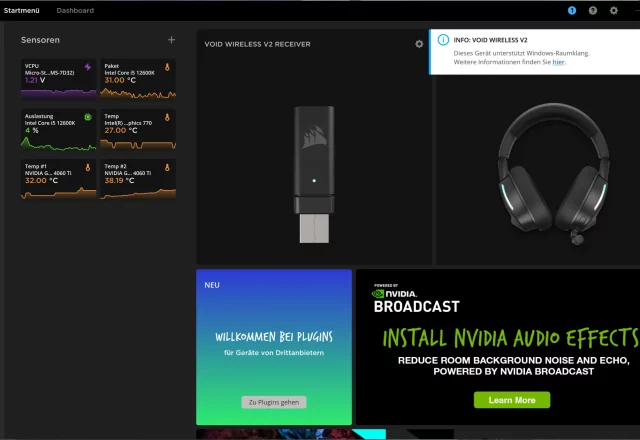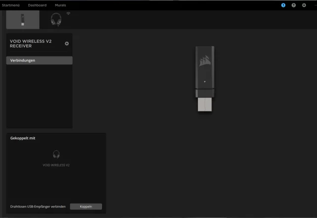 Die Verbindung über den USB-Adapter ist in der Praxis noch einfacher, wir schließen den Adapter an einen PC an und starten das Headset, schon ist die Verbindung hergestellt und die Tonübertragung läuft. Wir installieren die iCUE Software, die wir im Folgenden vorstellen möchten.