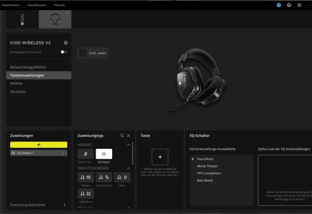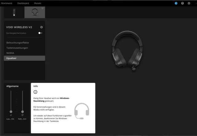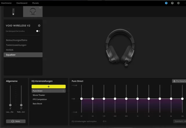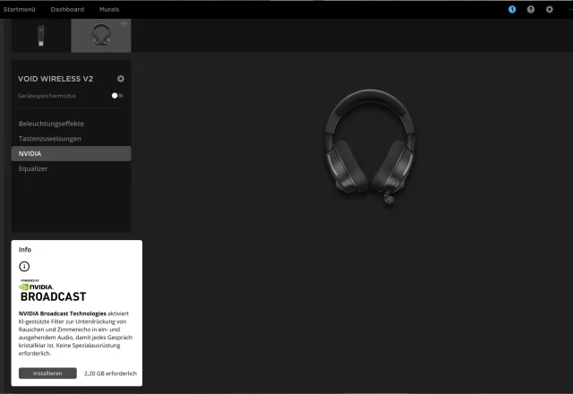 Für den Adapter gibt es in der Software nur eine Konfigurationsmöglichkeit, nämlich die Kopplung eines Headsets. Damit wäre es möglich, den Adapter oder das Headset auszutauschen, wenn eines der Geräte defekt ist. Für das Headset selbst finden wir weitere Optionen. Als Erstes haben wir die Möglichkeit die Beleuchtungseffekte des Headsets anzupassen, dazu können verschiedene Beleuchtungsebenen definiert werden. In der Tastenbelegung können wir die Funktion der Seitentaste definieren, hier haben wir verschiedene Optionen, die nicht nur auf das Headset, sondern auch auf den PC wirken können. In unserer frühen Version der Software hat die Belegung leider noch nicht funktioniert. Unter Nvidia lässt sich Nvidia Broadcast einrichten, wofür ein weiterer Download notwendig ist. Im Equalizer können verschiedene Presets definiert werden.