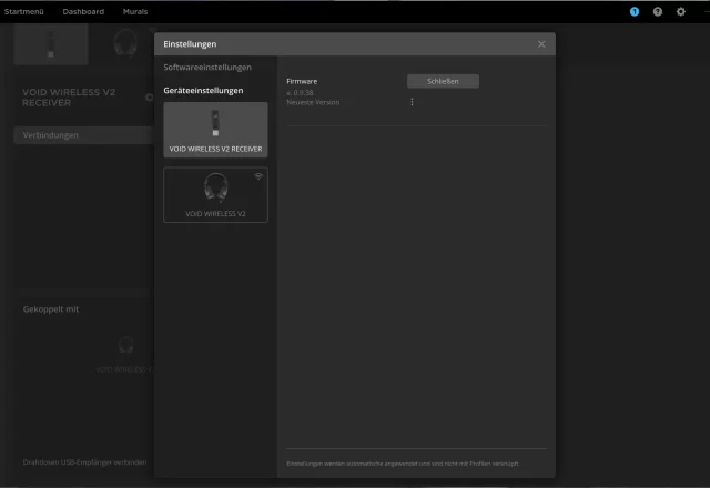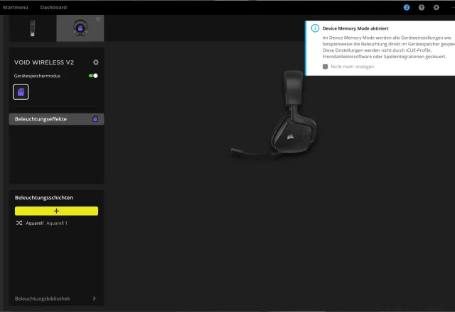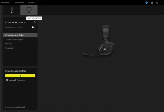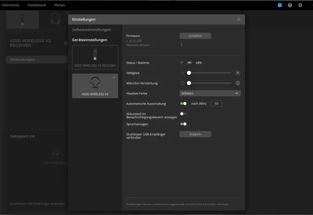 Unter dem Namen iCUE bietet Corsair eine zentrale Software zur Steuerung und Individualisierung der eigenen Produkte an. Die Corsair Void Wireless V2 werden in der Software direkt erkannt und ein Update der Software gestartet. In der Software finden wir den Adapter und das Headset getrennt voneinander aufgelistet, wir können für beide Geräte nach Firmware-Updates suchen und für das Headset einige Einstellungen vornehmen: