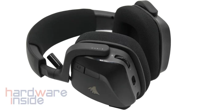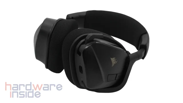 Wir betrachten hier die schwarze Variante des Corsair VOID Wireless V2, bei der alle Teile des Headsets, einschließlich der Ohr- und Kopfpolster, schwarz sind. Neben der schwarzen Variante ist auch eine weiße Variante des Headsets im Handel erhältlich. Das Headset besteht überwiegend aus Hartplastik, der Bügel ist mit einem Kopfpolster versehen, aus dem Bügel geht die Aufhängung der Ohrmuscheln hervor. Der Kopfhörer ist in der Höhe über einen Bereich von ca. 4 cm stufenlos verstellbar. An der Aufhängung können die Ohrmuscheln um 90° nach innen gedreht werden, was nicht nur beim Aufsetzen, sondern auch beim Tragen einen hohen Komfort bietet. Die Ohrmuscheln sind auf der Rückseite mit dem Bügel verbunden, wobei die Verbindung ein geringes Spiel für die vertikale Verstellung zulässt.