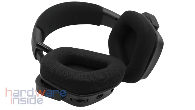 Das Mikrofon ist fest in der linken Ohrmuschel installiert, kann nicht entfernt werden, ist aber auf einem Schaltmechanismus montiert, der es beim Ausklappen aktiviert. Es hat eine Länge von 13 cm und kann flexibel positioniert werden. Obwohl der Hersteller angibt, dass das Mikrofon omnidirektional ist, gibt es im Gehäuse des Mikrofons nur eine Aussparung in einer Richtung, ein Filter aus Schaumstoff o.ä. ist nicht vorhanden. An der Unterseite der Ohrmuschel befindet sich ein USB-C-Anschluss, der zum Aufladen, nicht aber zum Betrieb des Headsets genutzt werden kann. Dahinter und somit an der unteren Rückseite befindet sich ein Wippschalter, mit dem die Lautstärke eingestellt werden kann. Mit dem oberen kann das Headset ein- und ausgeschaltet sowie zwischen Bluetooth und 2,4 GHz Dongle umgeschaltet werden. Der untere Taster ist konfigurierbar, in der Standardkonfiguration dient er zum Umschalten zwischen verschiedenen Sound-Presets.