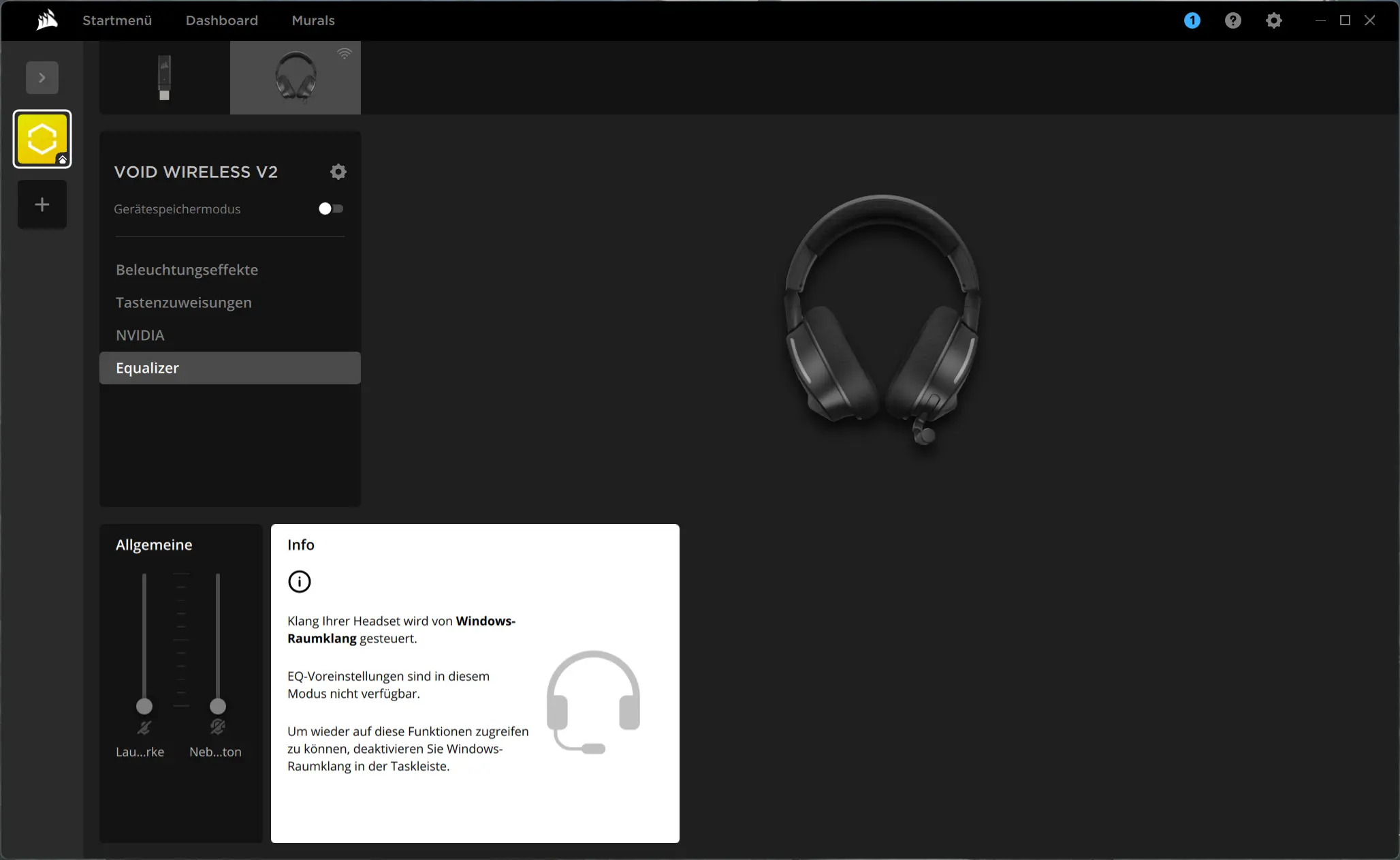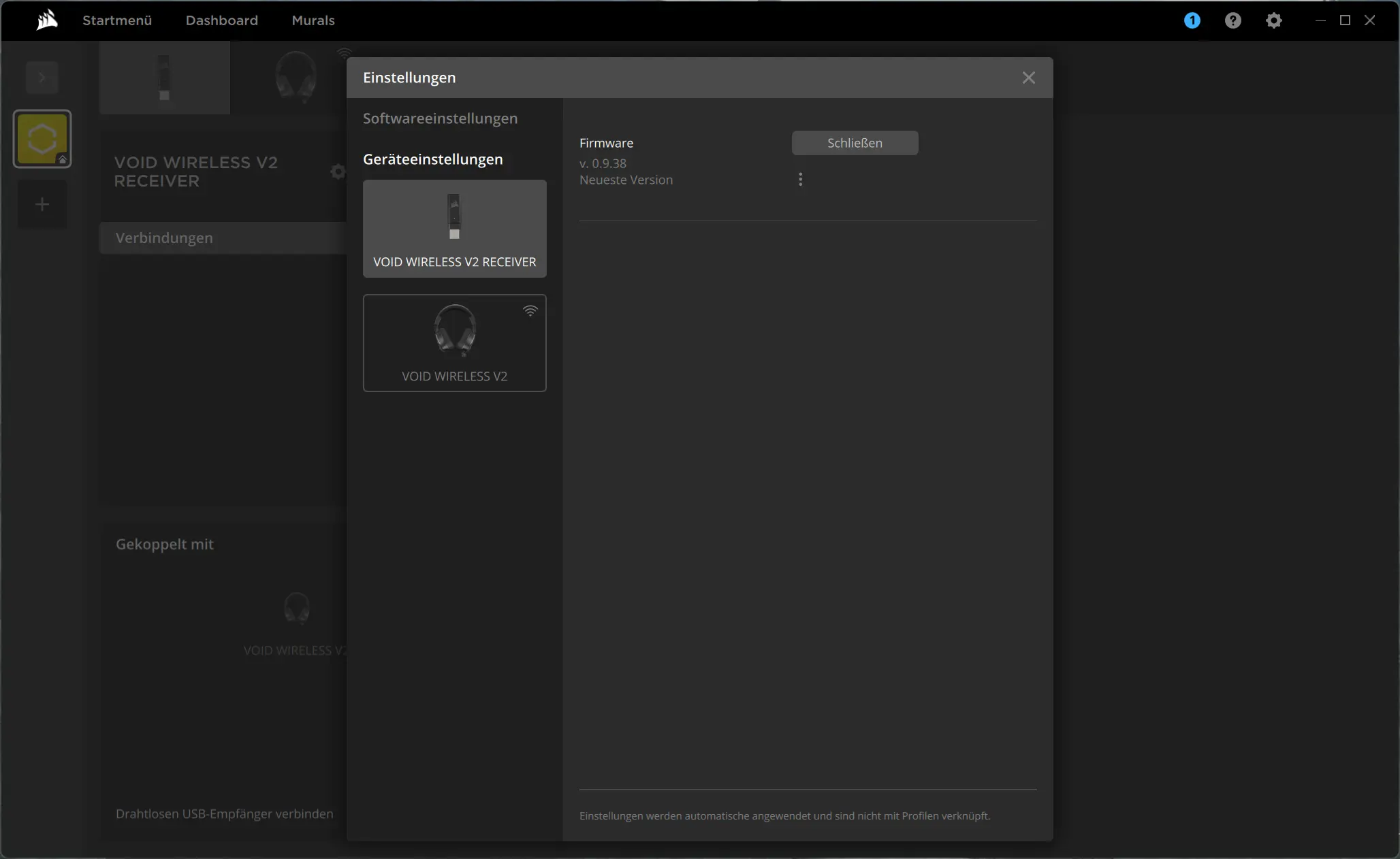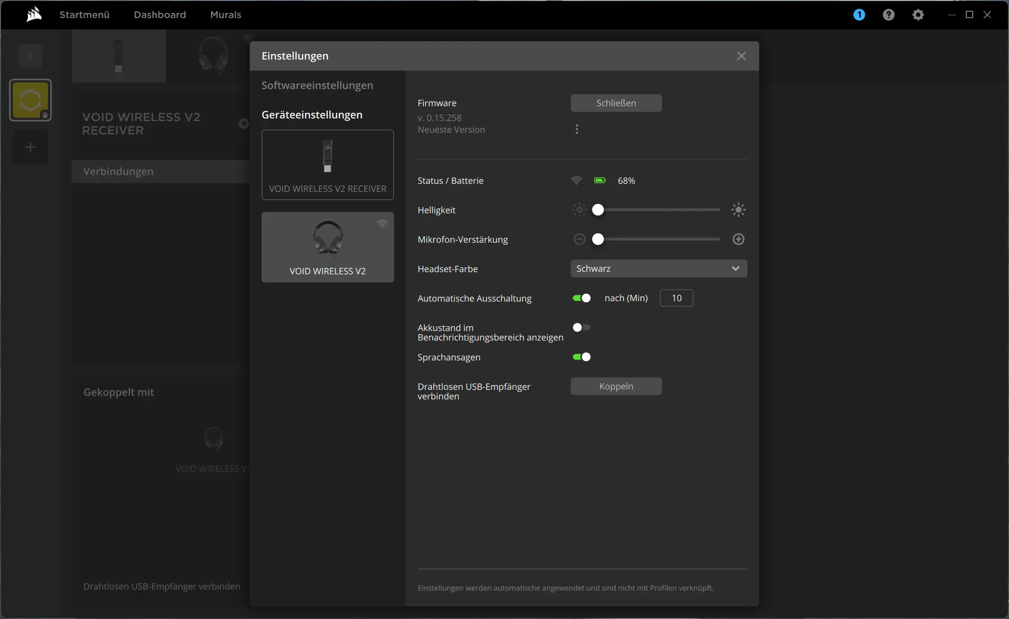 Unter dem Namen iCUE bietet Corsair eine zentrale Software zur Steuerung und Individualisierung der eigenen Produkte an. Die Corsair Void Wireless V2 werden in der Software direkt erkannt und ein Update der Software gestartet. In der Software finden wir den Adapter und das Headset getrennt voneinander aufgelistet, wir können für beide Geräte nach Firmware-Updates suchen und für das Headset einige Einstellungen vornehmen: