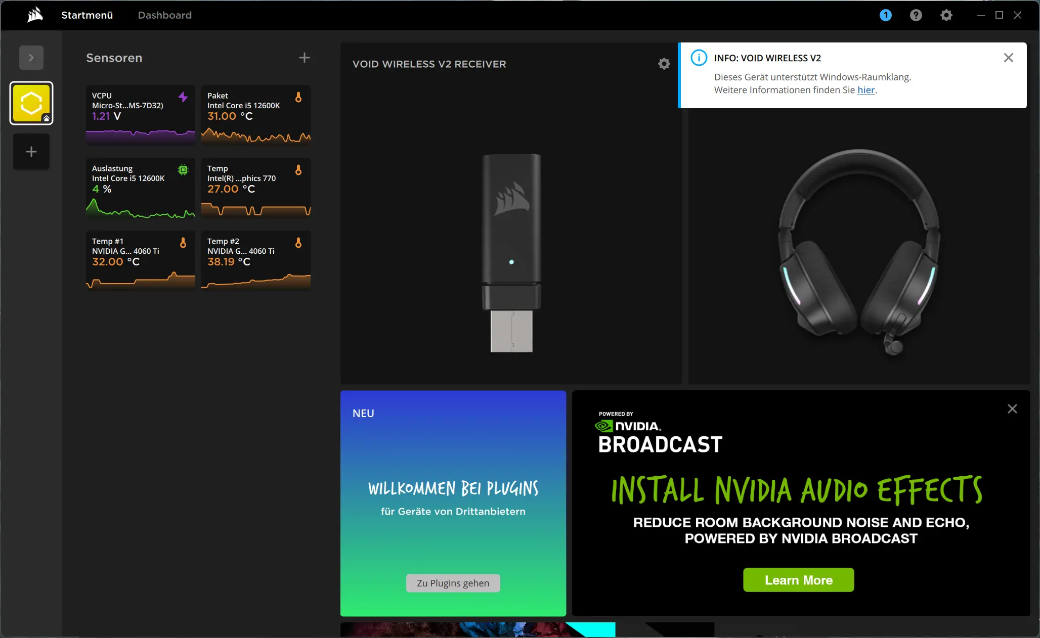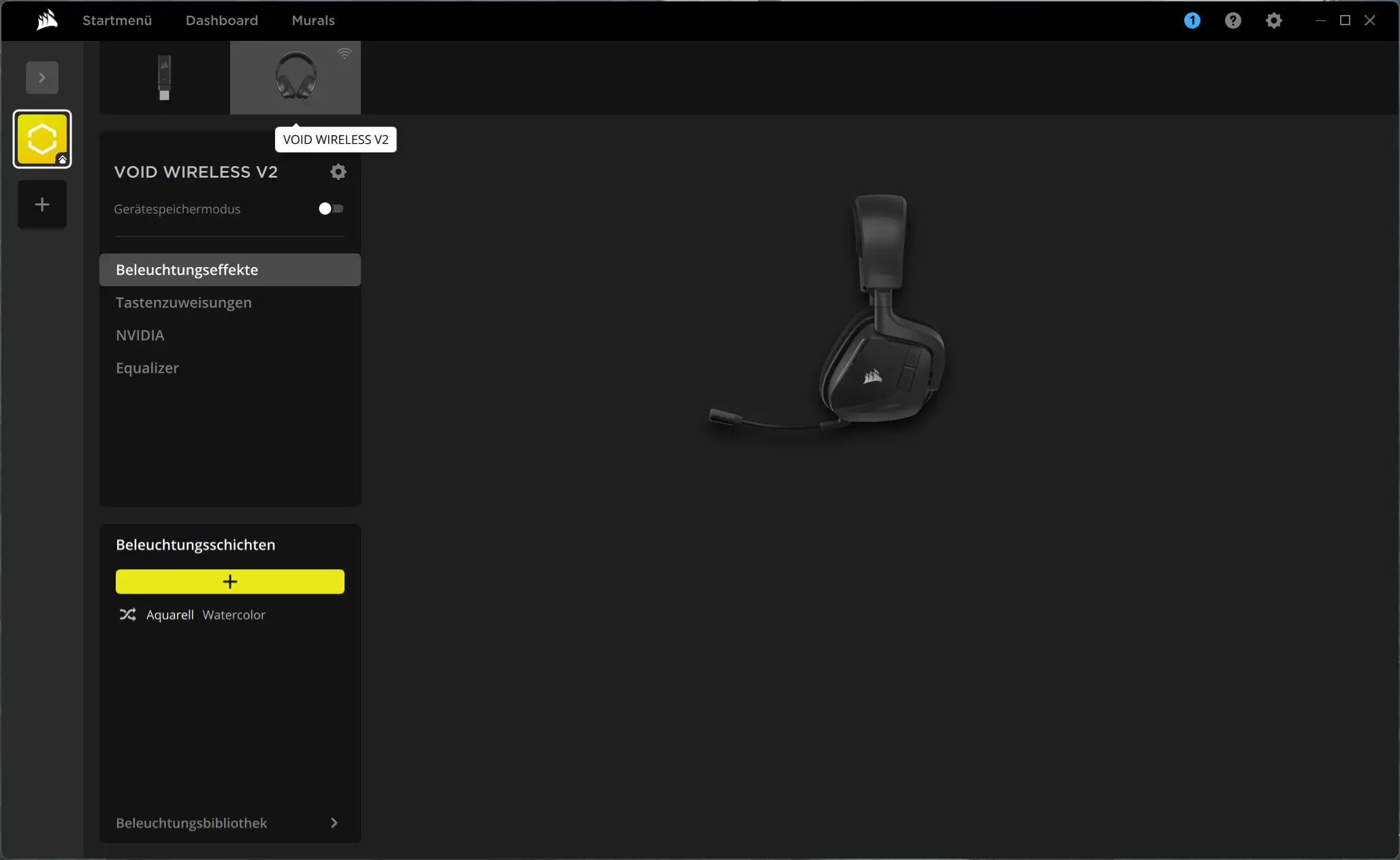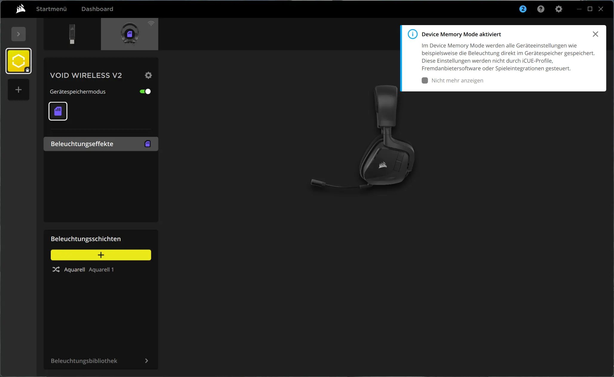 Unter dem Namen iCUE bietet Corsair eine zentrale Software zur Steuerung und Individualisierung der eigenen Produkte an. Die Corsair Void Wireless V2 werden in der Software direkt erkannt und ein Update der Software gestartet. In der Software finden wir den Adapter und das Headset getrennt voneinander aufgelistet, wir können für beide Geräte nach Firmware-Updates suchen und für das Headset einige Einstellungen vornehmen: