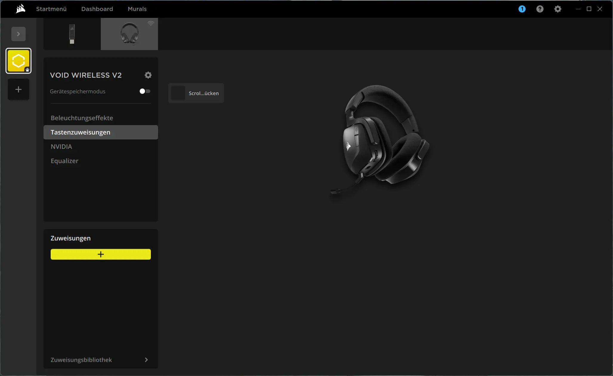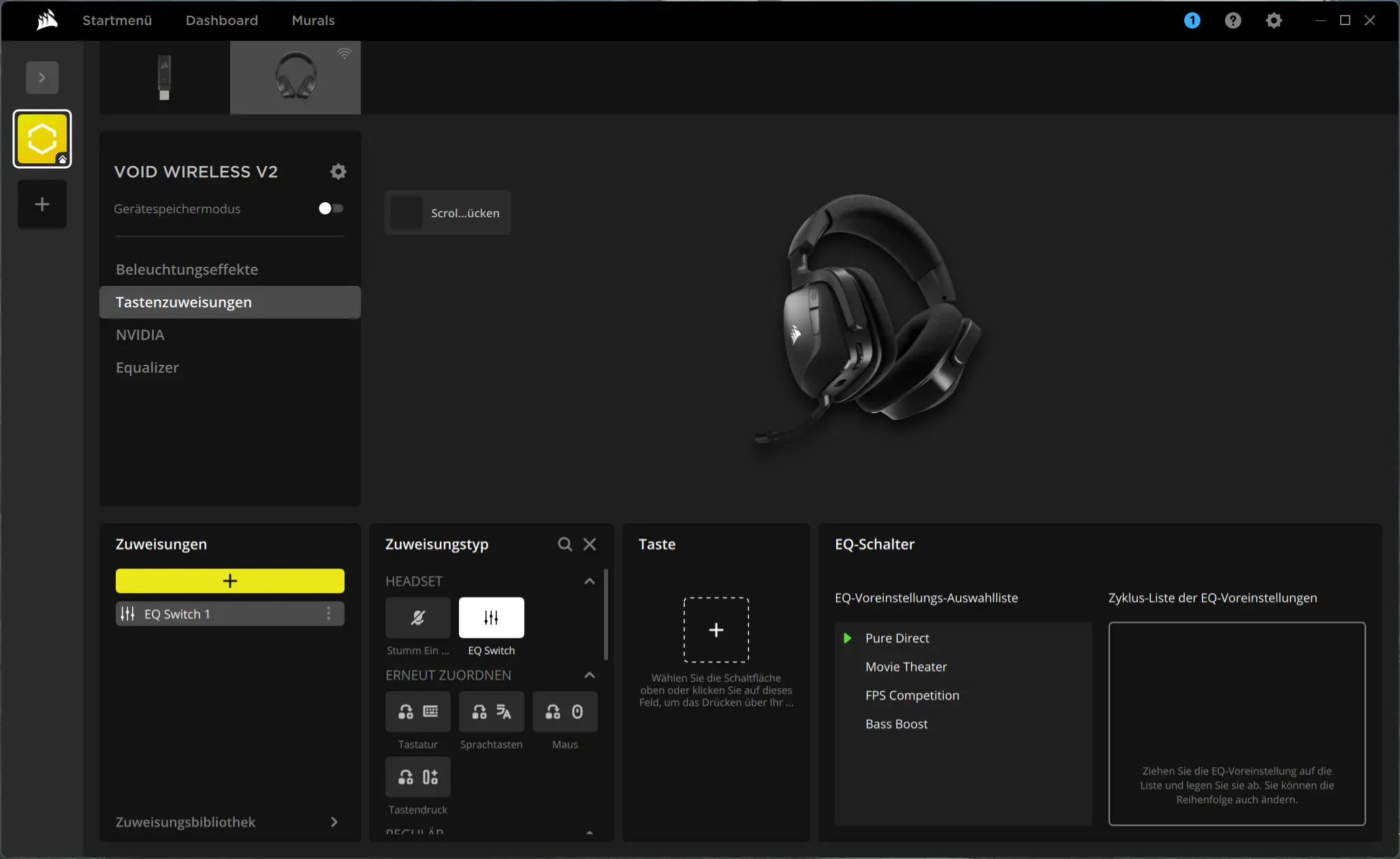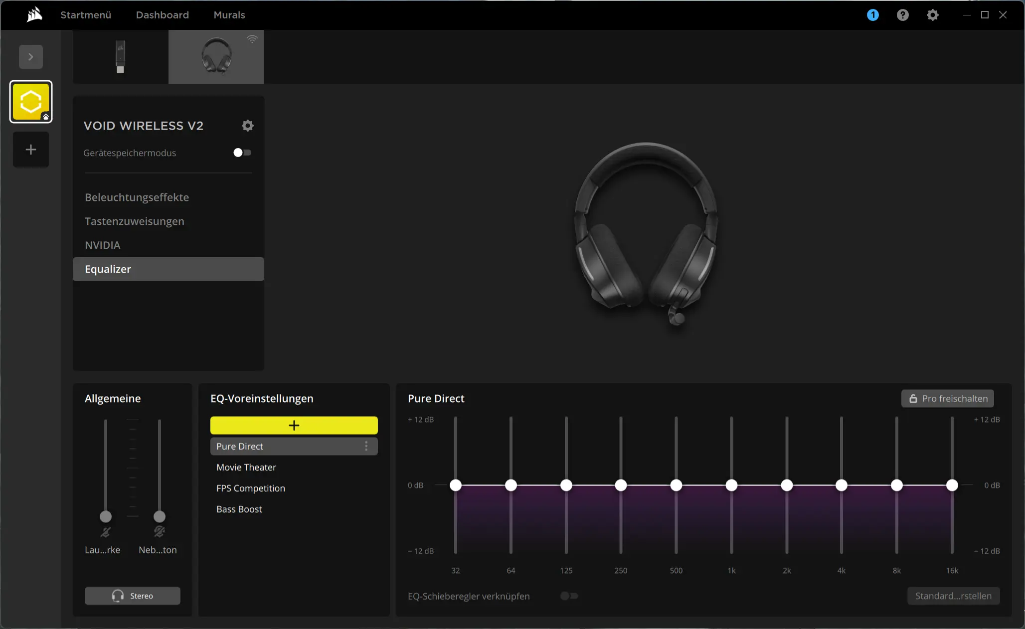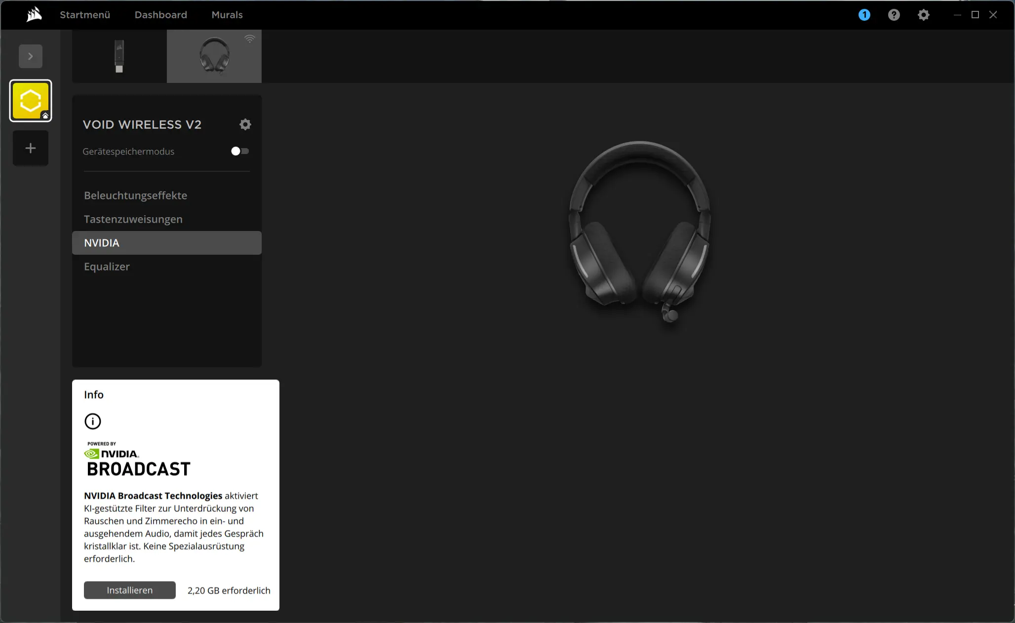 Für den Adapter gibt es in der Software nur eine Konfigurationsmöglichkeit, nämlich die Kopplung eines Headsets. Damit wäre es möglich, den Adapter oder das Headset auszutauschen, wenn eines der Geräte defekt ist. Für das Headset selbst finden wir weitere Optionen. Als Erstes haben wir die Möglichkeit die Beleuchtungseffekte des Headsets anzupassen, dazu können verschiedene Beleuchtungsebenen definiert werden. In der Tastenbelegung können wir die Funktion der Seitentaste definieren, hier haben wir verschiedene Optionen, die nicht nur auf das Headset, sondern auch auf den PC wirken können. In unserer frühen Version der Software hat die Belegung leider noch nicht funktioniert. Unter Nvidia lässt sich Nvidia Broadcast einrichten, wofür ein weiterer Download notwendig ist. Im Equalizer können verschiedene Presets definiert werden.