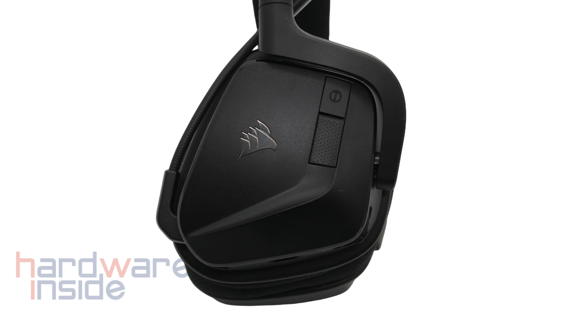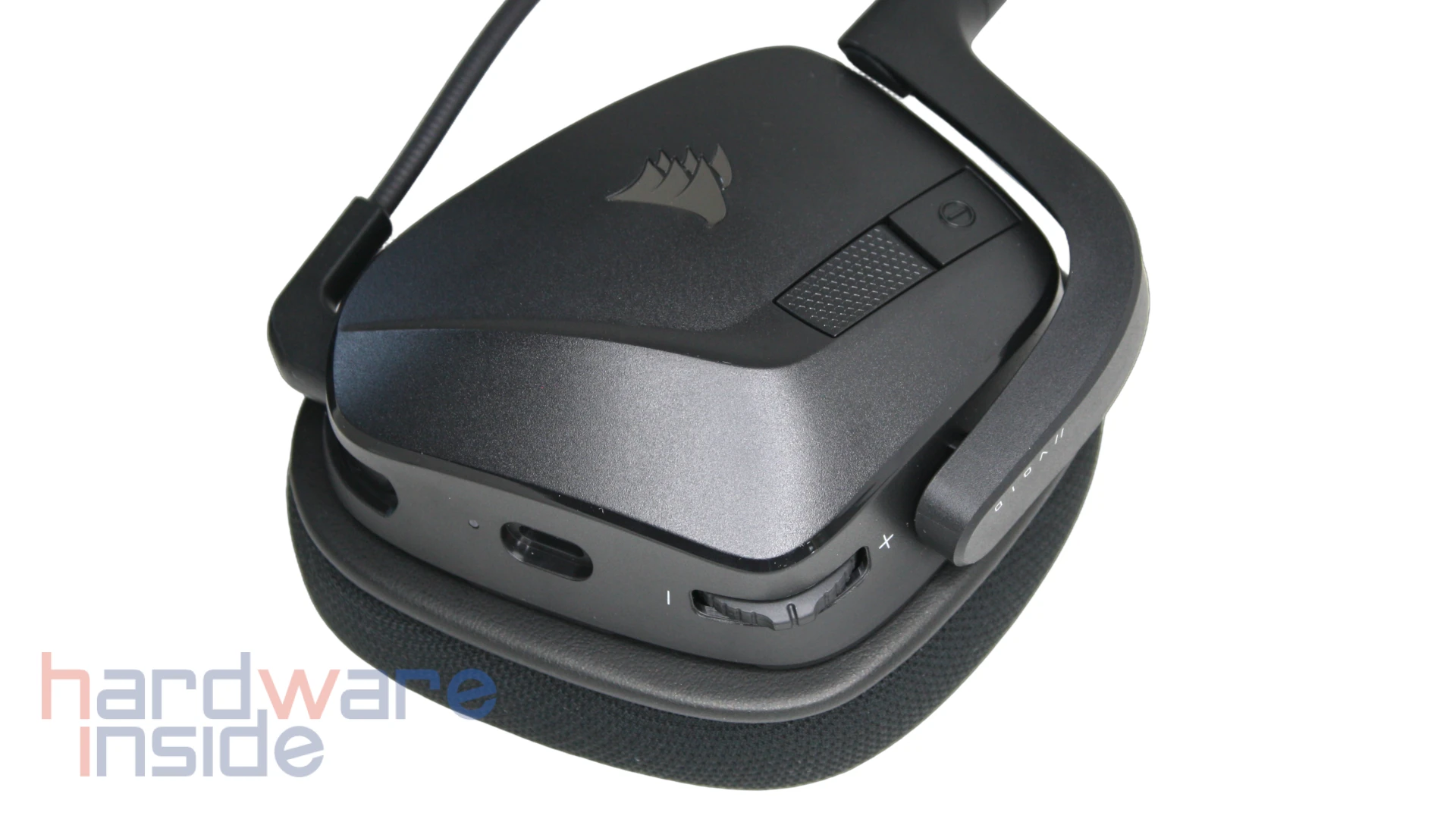 Das Mikrofon ist fest in der linken Ohrmuschel installiert, kann nicht entfernt werden, ist aber auf einem Schaltmechanismus montiert, der es beim Ausklappen aktiviert. Es hat eine Länge von 13 cm und kann flexibel positioniert werden. Obwohl der Hersteller angibt, dass das Mikrofon omnidirektional ist, gibt es im Gehäuse des Mikrofons nur eine Aussparung in einer Richtung, ein Filter aus Schaumstoff o.ä. ist nicht vorhanden. An der Unterseite der Ohrmuschel befindet sich ein USB-C-Anschluss, der zum Aufladen, nicht aber zum Betrieb des Headsets genutzt werden kann. Dahinter und somit an der unteren Rückseite befindet sich ein Wippschalter, mit dem die Lautstärke eingestellt werden kann. Mit dem oberen kann das Headset ein- und ausgeschaltet sowie zwischen Bluetooth und 2,4 GHz Dongle umgeschaltet werden. Der untere Taster ist konfigurierbar, in der Standardkonfiguration dient er zum Umschalten zwischen verschiedenen Sound-Presets.