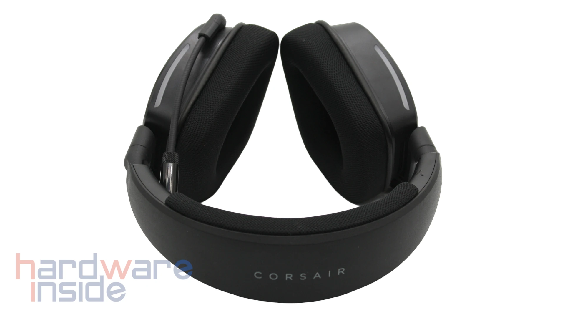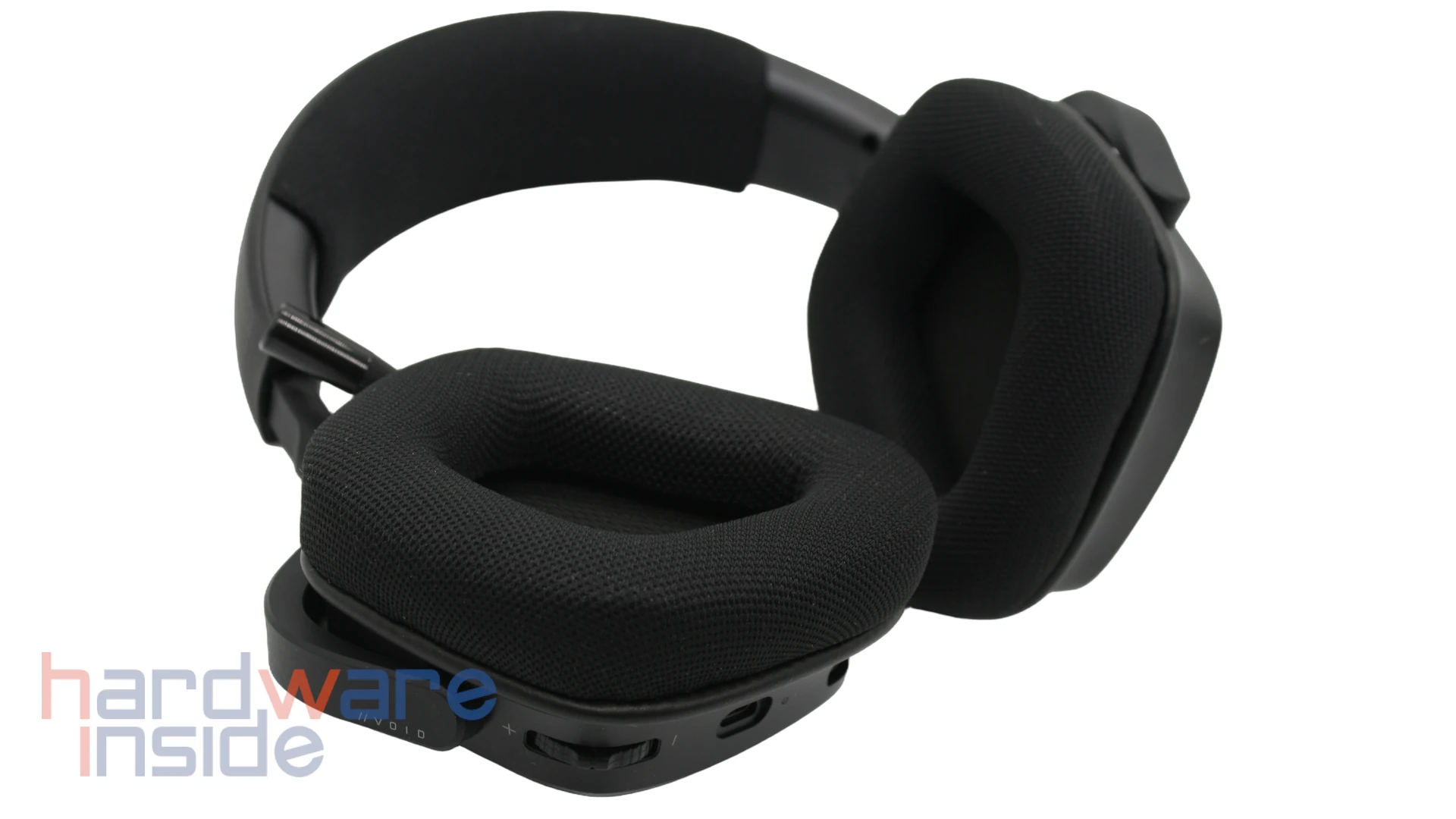 Wir betrachten hier die schwarze Variante des Corsair VOID Wireless V2, bei der alle Teile des Headsets, einschließlich der Ohr- und Kopfpolster, schwarz sind. Neben der schwarzen Variante ist auch eine weiße Variante des Headsets im Handel erhältlich. Das Headset besteht überwiegend aus Hartplastik, der Bügel ist mit einem Kopfpolster versehen, aus dem Bügel geht die Aufhängung der Ohrmuscheln hervor. Der Kopfhörer ist in der Höhe über einen Bereich von ca. 4 cm stufenlos verstellbar. An der Aufhängung können die Ohrmuscheln um 90° nach innen gedreht werden, was nicht nur beim Aufsetzen, sondern auch beim Tragen einen hohen Komfort bietet. Die Ohrmuscheln sind auf der Rückseite mit dem Bügel verbunden, wobei die Verbindung ein geringes Spiel für die vertikale Verstellung zulässt.