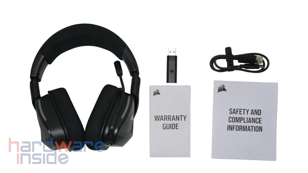Der Lieferumfang des Corsair Void Wireless V2 ist recht übersichtlich. Neben dem Headset selbst liegen ein USB-Dongle, ein USB-C-Ladekabel und zwei Booklets bei. Eine Tragetasche ist leider nicht dabei.