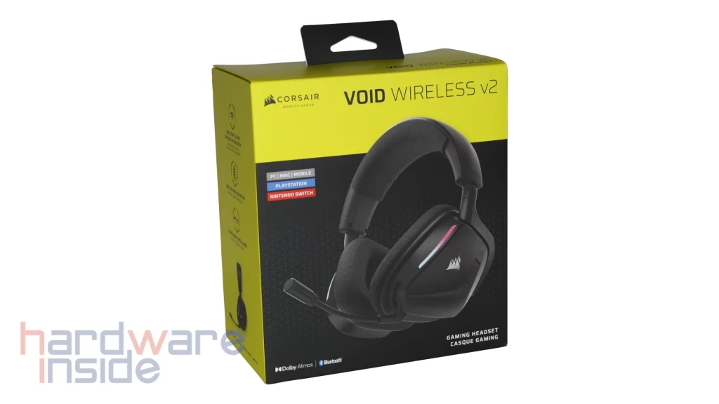 Die Produktverpackung des Corsair Void Wireless V2 folgt dem bekannten Gestaltungsschema des Herstellers, so sind Hersteller- und Produktname auf einem neongelben Hintergrund platziert, während der Rest der Verpackung von einem schwarzen Hintergrund dominiert wird. Auf der Vorderseite ist eine Abbildung des neuen Void Wireless V2 zu sehen, wobei auch hier die RGB-Elemente hervorgehoben sind. Die Unterstützung von Dolby Atmos und die Unterstützung von PC, MAC, mobilen Geräten, Playstation und Nintendo Switch werden hervorgehoben. Auf der Rückseite sind weitere Features des Headsets in vier Sprachen aufgelistet.
