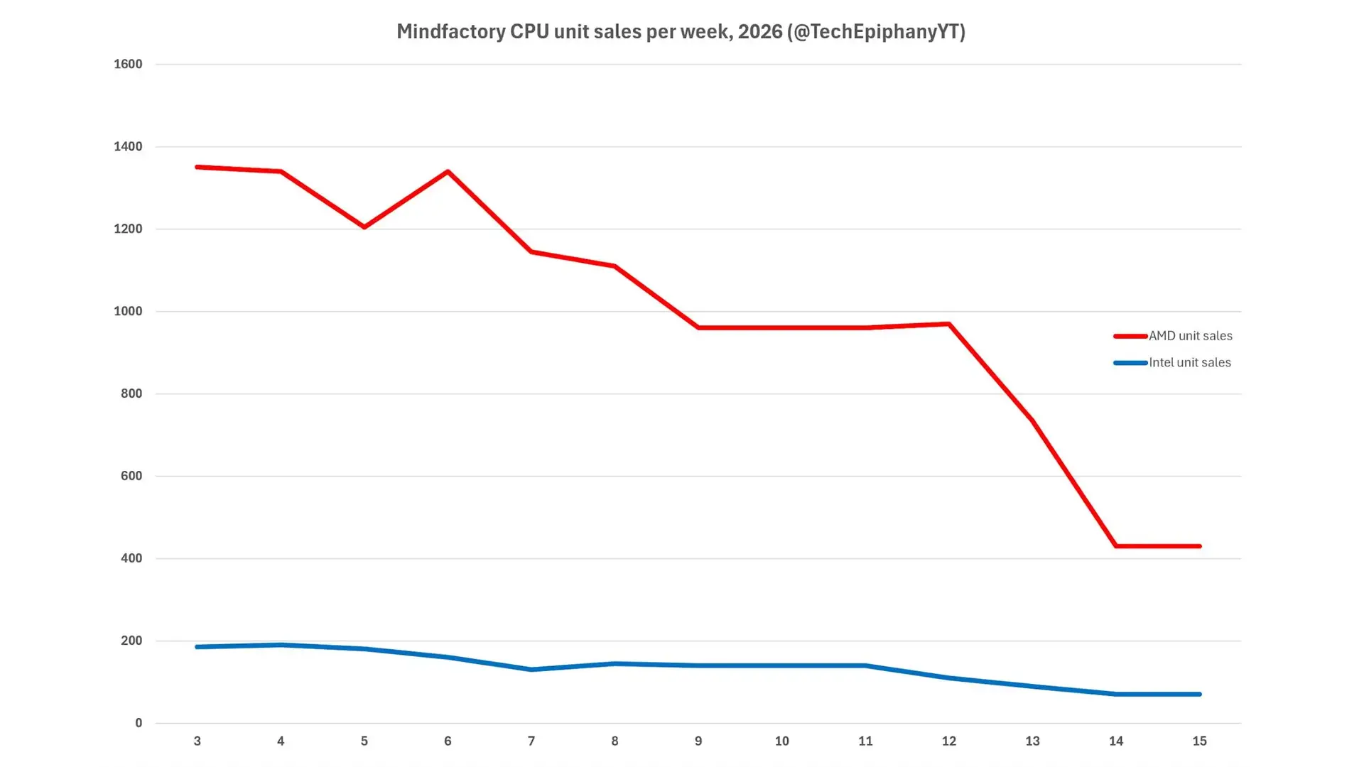 Die CPU-Verkäufe im Einzelhandel sind Anfang 2026 deutlich zurückgegangen. Daten des deutschen Händlers Mindfactory zeigen einen klaren Rückgang der Stückzahlen zwischen Kalenderwoche 3 und 15. Auffällig: Sowohl AMD als auch Intel sind gleichermaßen betroffen – ein Zeichen für eine insgesamt sinkende Nachfrage statt verschobener Marktanteile. Viele Nutzer, insbesondere Gamer und Enthusiasten, verschieben derzeit Upgrades.