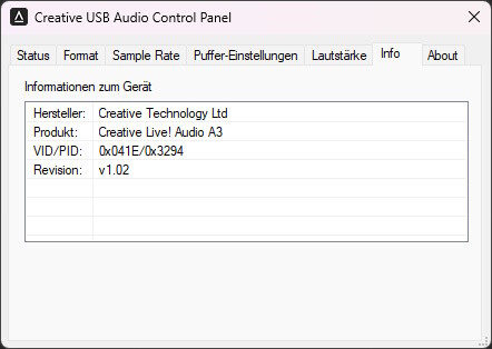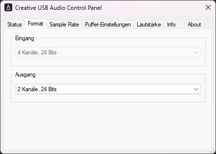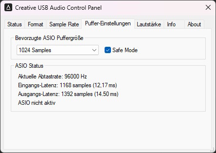 Die Software startet nach erfolgreicher Installation mit Windows. Dabei bleibt sie aber minimiert in der Taskleiste neben der Uhrzeit. Ein Klick auf das Symbol in der Taskleiste öffnet das Audio Control Panel. Dies ist einfach und übersichtlich gestaltet. Hier lassen sich ein paar Einstellungen wie das Format, Sample-Rate, Puffer und Lautstärke einstellen. All diese Einstellungen wären aber auch über die Audioeinstellungen von Windows möglich.