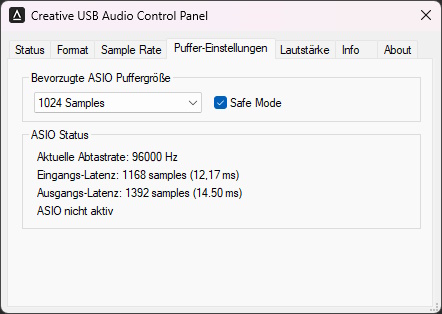 Die Software startet nach erfolgreicher Installation mit Windows. Dabei bleibt sie aber minimiert in der Taskleiste neben der Uhrzeit. Ein Klick auf das Symbol in der Taskleiste öffnet das Audio Control Panel. Dies ist einfach und übersichtlich gestaltet. Hier lassen sich ein paar Einstellungen wie das Format, Sample-Rate, Puffer und Lautstärke einstellen. All diese Einstellungen wären aber auch über die Audioeinstellungen von Windows möglich.
