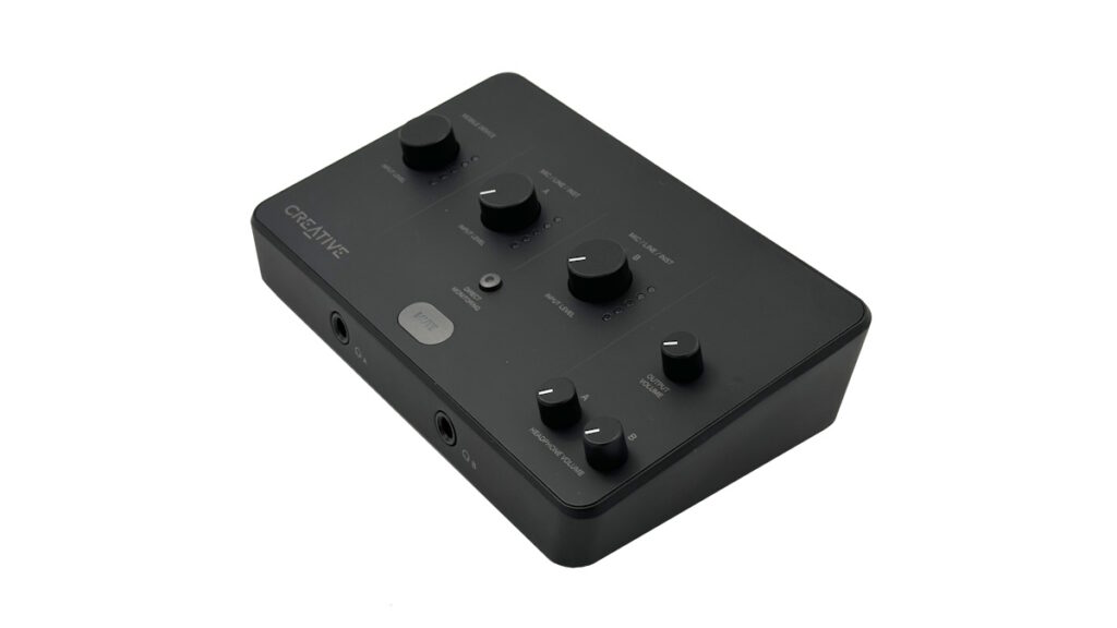 Das Gehäuse des CREATIVE LIVE! AUDIO A3 Audiointerface besteht vollständig aus schwarzem Kunststoff. Die Oberseite verfügt über sechs Drehregler und zwei Tasten. Neben den drei großen Drehreglern befinden sind LED-Anzeigen, welche später den Pegel des jeweiligen Eingangs darstellen. An der Vorderseite sind zwei 6,35 mm (¼ Zoll) Kopfhöreranschlüsse. Wer hier Kopfhörer mit 3,5 mm Anschluss nutzen will, benötigt einen Adapter, welches es bereits recht günstig zu kaufen gibt. Manche hochwertigere Kopfhörer haben den Adapter auch meist direkt im Lieferumfang. In der Seitenansicht kann man eine Keilform erkennen. Dadurch das die Oberseite etwas geneigt ist, können die Regler besser bedient und die Beschriftung besser gelesen werden.