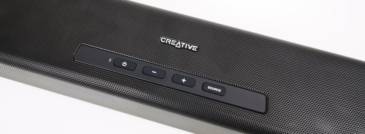 Die Soundbar macht trotz der kompakten Ausmaße von 565 x 75 x 88 mm (B x H x T) einen sehr massiven und hochwertigen Eindruck. Mit den oben platzierten Bedienelementen lassen sich die Lautstärke und Eingangsquelle einstellen. Im Inneren kommen zwei 2,25″ x 3,85″ Racetrack-Treiber mit einer Leistung von bis zu 60 Watt zum Einsatz.