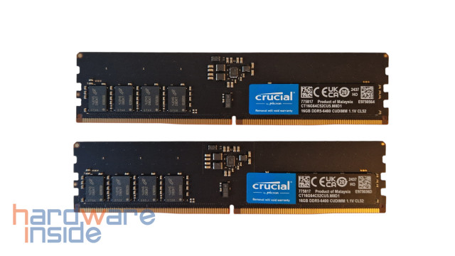 Crucial verbaut auch bei den CUDIMMs Speicher aus dem Hause Micron und verzichtet gänzlich auf Heatspreader. Vorderseitig ist ein Aufkleber angebracht , der die Echtheit der Module bestätigt und zusätzlich über die technischen Daten informiert. Mit einer Höhe von nur 32 mm ist dieser Speicher besonders geeignet für kleinere Systeme oder unter Verwendung eines Luftkühlers.
