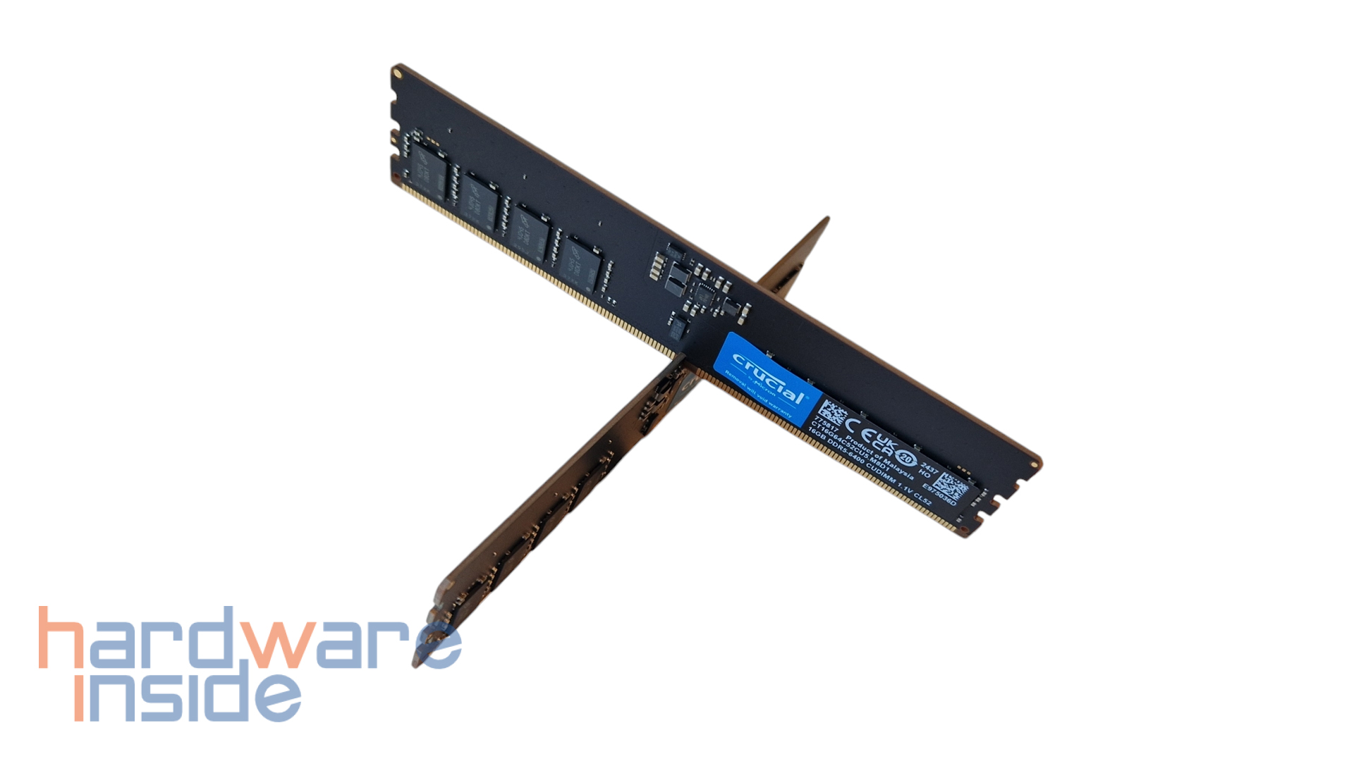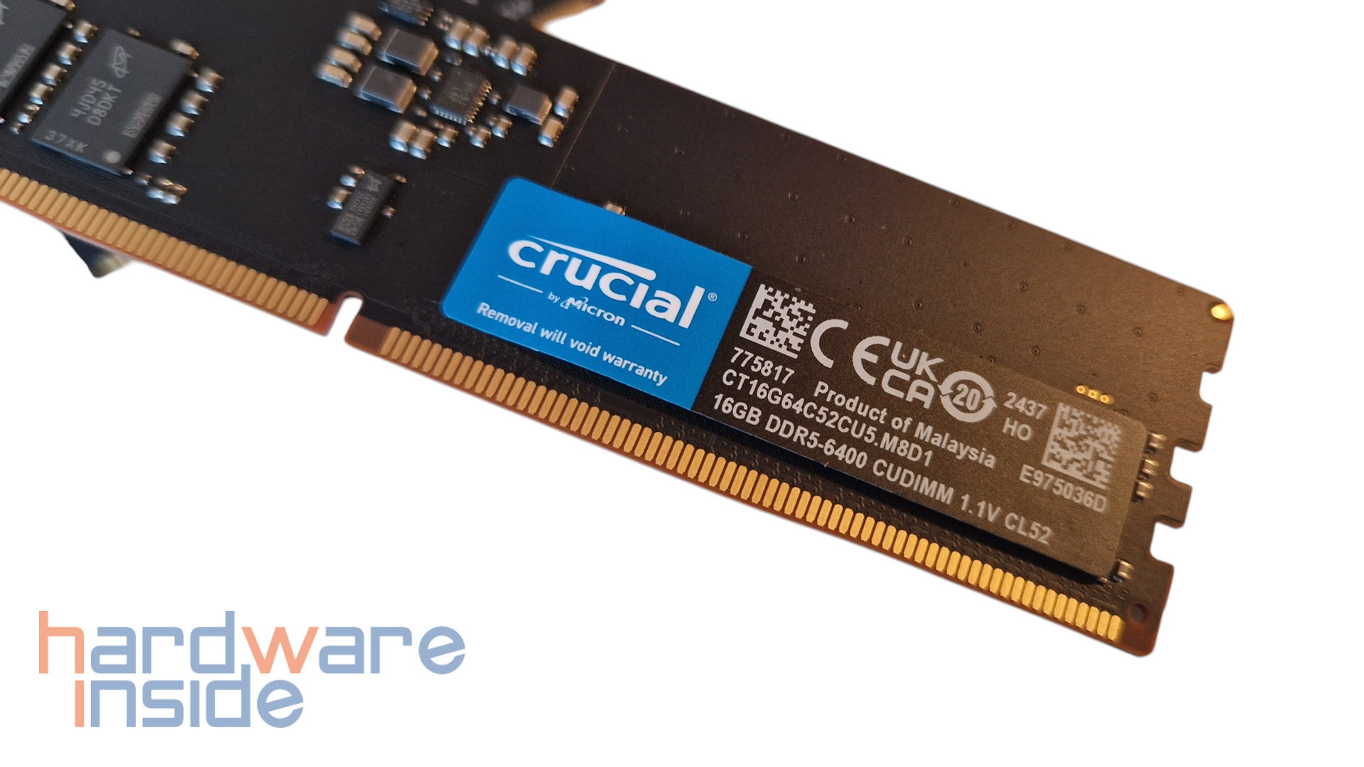 Crucial verbaut auch bei den CUDIMMs Speicher aus dem Hause Micron und verzichtet gänzlich auf Heatspreader. Vorderseitig ist ein Aufkleber angebracht , der die Echtheit der Module bestätigt und zusätzlich über die technischen Daten informiert. Mit einer Höhe von nur 32 mm ist dieser Speicher besonders geeignet für kleinere Systeme oder unter Verwendung eines Luftkühlers.