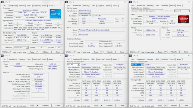 Zwei weitere Durchläufe folgen mit den aktivierten XMP-Profilen bei 5600 MT und 6000 MT. Dafür müssen wir hier jeweils im BIOS/UEFI das entsprechende Profil laden. Im Anschluss prüfen wir auch mit CPU-Z, ob alle Werte richtig übernommen wurden. Dann folgt jeweils ein Durchlauf mit dem Cache & Memory Benchmark von AIDA64. Bei 5600 MT erreichen wir nun beim Lesen 73368 MB/s, 75967 MB/s im Schreiben und beim Kopieren 69732 MB/s, mit einer Latenz von 75 ns. Mit dem Profil 1 erhöht sich die Geschwindigkeit auf 6000 MT und wir erreichen beim Lesen nun 78461 MB/s sowie 79882 MB/s im Schreiben. Der Durchsatz beim Kopieren liegt bei 74173 MB/s und die Latenz sinkt noch mal auf 72,8 ns.