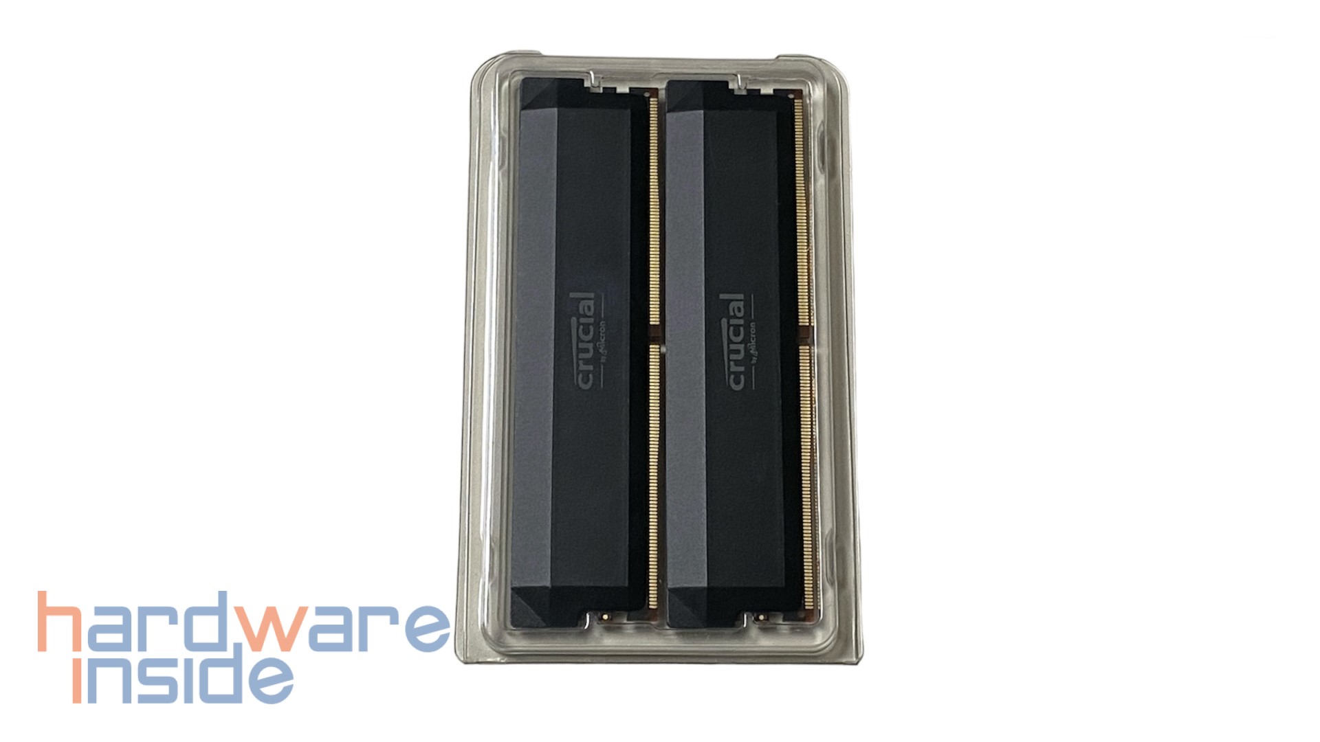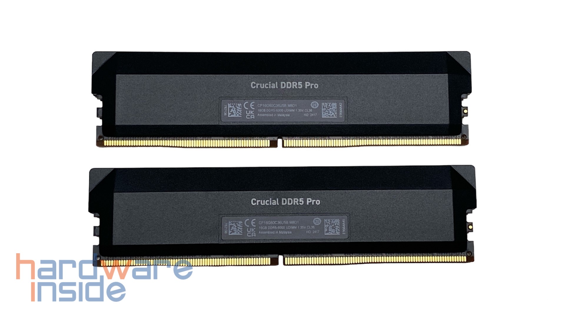 Auch auf der Rückseite setzt sich das schlichte Design fort, hier ist der Schriftzug Crucial DDR5 Pro ebenfalls in Weiß aufgedruckt. Darunter befindet sich ein Typenschild in Form eines schwarzen Aufklebers. Hier ist die Produktbezeichnung, die Kapazität, der RAM-Typ, die Spannung, die Latenz und das Herstellungsland aufgedruckt.