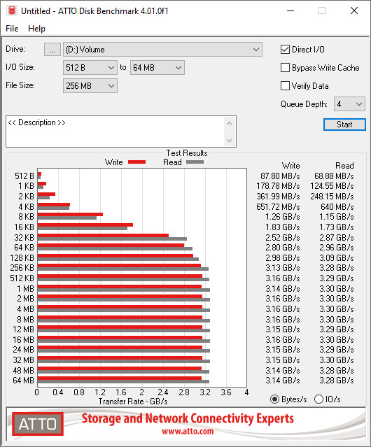 Als Nächstes betrachten wir die Geschwindigkeiten in Abhängigkeit von der I/O-Größe mit dem ATTO Disk Benchmark. Unsere Maximalwerte erreichen wir ab einer IO-Größe von 256 kb, die auch bei den nachfolgenden Größen stabil bleibt. Die gemessenen Geschwindigkeiten können sich sehen lassen, liegen aber etwas unter den Herstellerangaben.
