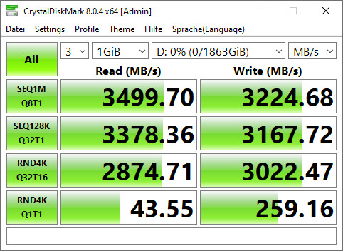Eine erste Einschätzung der Performance liefert uns der Benchmark von CrystalDiskMark. Hier erreichen wir mit der Crucial P3 eine Lesegeschwindigkeit von ca. 3.500 MB/s und eine Schreibgeschwindigkeit von gut 3.200 MB/s. Während die Lesegeschwindigkeit mit einer Punktlandung exakt den Herstellerangaben entspricht, erreicht unser Testmuster bei der Schreibgeschwindigkeit sogar um 200 MB/s höhere Werte.