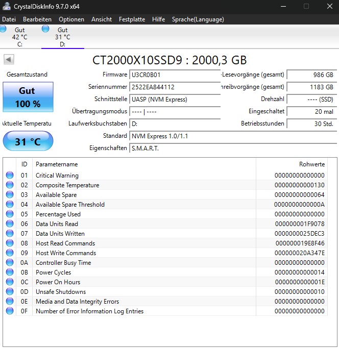 Um die Crucial X10 Portable SSD verwenden zu können stecken wir die SSD an einen USB‑C‑Port der Generation 3.2 unseres Computers. Der PC erkennt unsere SSD mit dem Namen CT2000X10SSD9. Zu Beginn informieren wir uns über den Integritätszustand des Laufwerks. Dazu verwenden wir die Software CrystaldiskInfo. So erfahren wir, ob es relevante Werte gibt, die von der Norm abweichen. In diesem Fall können wir keine Auffälligkeiten feststellen. Man sieht jedoch, dass es sich um ein fabrikneues Produkt handelt, welches von uns über 30 Betriebsstunden getestet wurde.