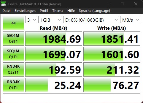 Mithilfe des CrystalDiskMark 9.0.1 erfahren wir mehr über die Geschwindigkeit der Crucial X10 Portable SSD. So erreicht die SSD eine Lesegeschwindigkeit von 1.984,69 MB/s und eine Schreibgeschwindigkeit von 1.851,41 MB/s. Der Hersteller verspricht beim Lesen eine Geschwindigkeit von 2.100 MB/s. Über unsere USB 3.2 Gen 2×2 Schnittstelle sind theoretisch 2,5 GB/s möglich, hier werden wir also nicht auf ein Bottleneck stoßen. Der vom Hersteller angegebene Wert wird hier leicht unterschritten. Eine dedizierte Angabe bezüglich der Schreibgeschwindigkeit von Seiten des Herstellers haben wir leider nicht. Wir können der hohen Geschwindigkeit jedoch auch entnehmen, dass es sich bei dem eigentlichen Speichermedium um eine NVME handelt. Eine herkömmliche SATA-SSD würde bei einer Geschwindigkeit von 550 MB/s limitieren. Darüber hinaus ist die Speicheranbindung der NVME wahrscheinlich mit zwei Lanes ausgestattet. NVMe-SSDs nutzen den PCIe-Bus, und ihre Geschwindigkeit hängt direkt von der Anzahl der verfügbaren Lanes ab. Eine High-End NVME arbeitet für Übertragungsgeschwindigkeiten ab 3,5 GB/s. Da der Hersteller eine Geschwindigkeit von 2.100 MB/s angibt, liegt die Vermutung nahe, dass diese die beschriebenen zwei Lanes bei einem PCIe 4.0 Bus verwendet.