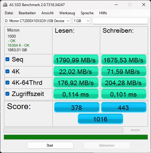 Um einen aussagekräftigen Test zu gewährleisten, unterziehen wir die Crucial X10 Portable SSD einem weiteren Test. Hierzu haben wir den Benchmark von AS SSD Benchmark gewählt. Hier ergibt sich bei der Lesegeschwindigkeit ein Wert von 1.790,99 MB/s und bei der Schreibgeschwindigkeit ein Wert von 1.675,53 MB/s. Im Vergleich zum CrystalDiskMark unterbieten wir die Herstellerangaben hier noch etwas mehr. Dies ist jedoch für den AS SSD Benchmark nicht untypisch und ist sehr wahrscheinlich auf die Nutzung eines anderen Testverfahrens zurückzuführen.
