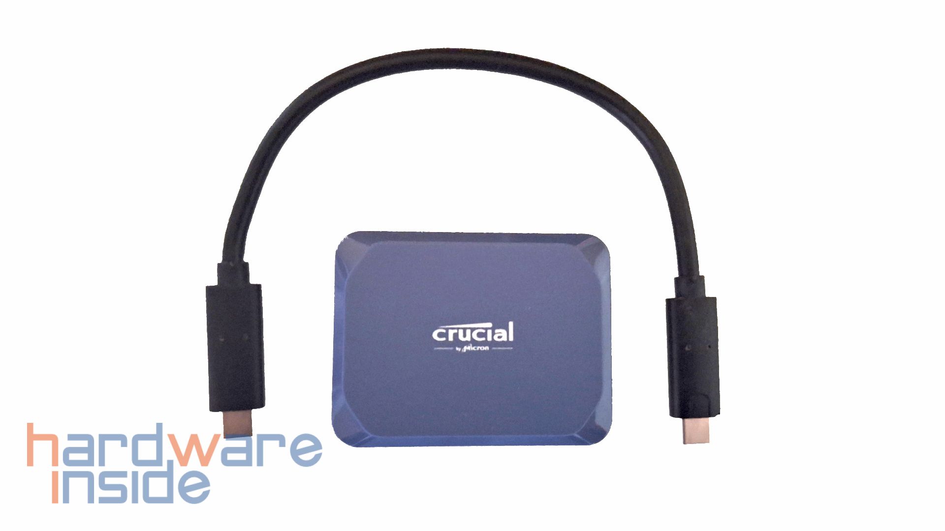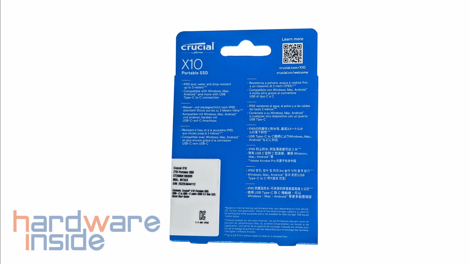 Der Lieferumfang hält sich in Grenzen, ist aber für die Produktkategorie nichts außergewöhnliches. In der kleinen Kartonage befindet sich die zunächst in Plastik eingeschweißte Crucial X10 Portable SSD sowie ein schwarzes USB-C auf USB-C-Kabel mit einer Länge von 23 cm. Außerdem liegt eine Kurzanleitung in elf verschiedenen Sprachen bei.