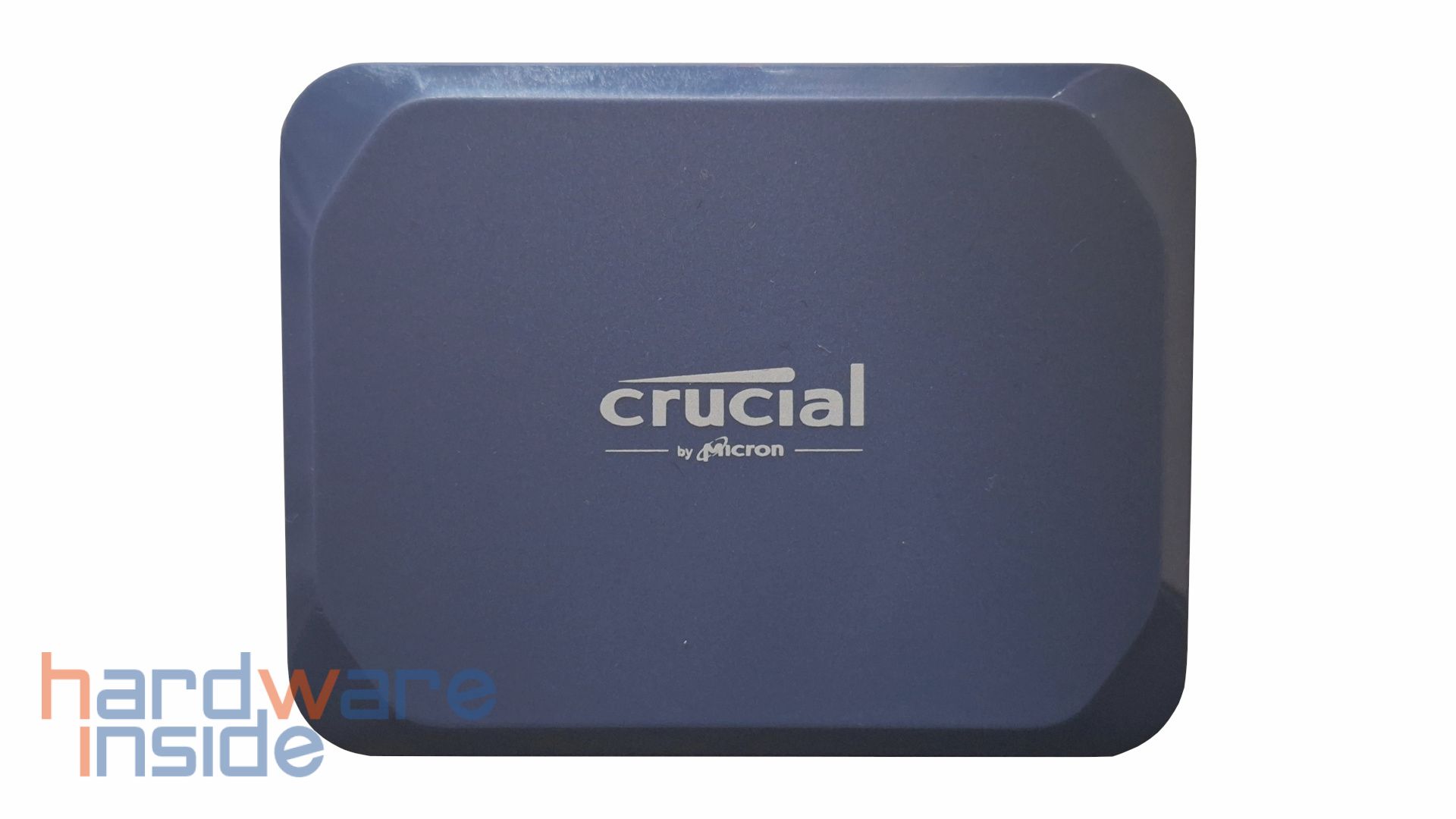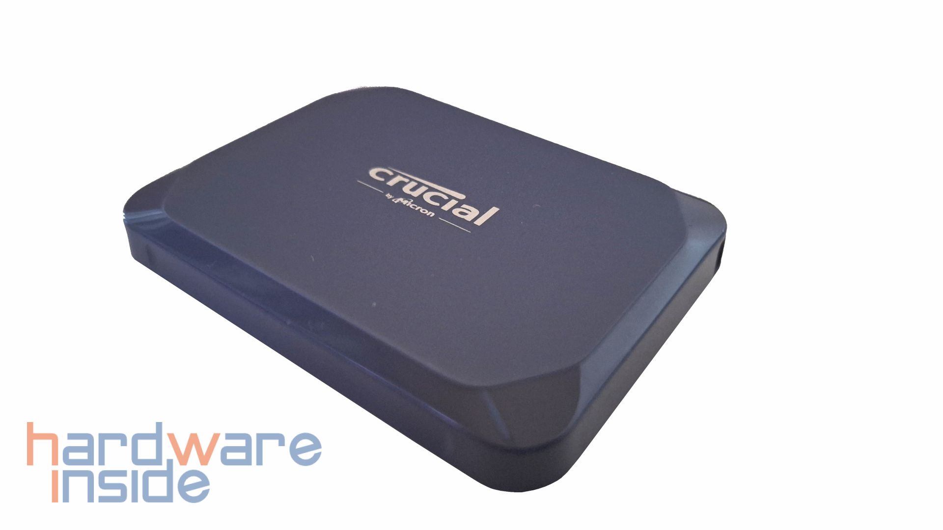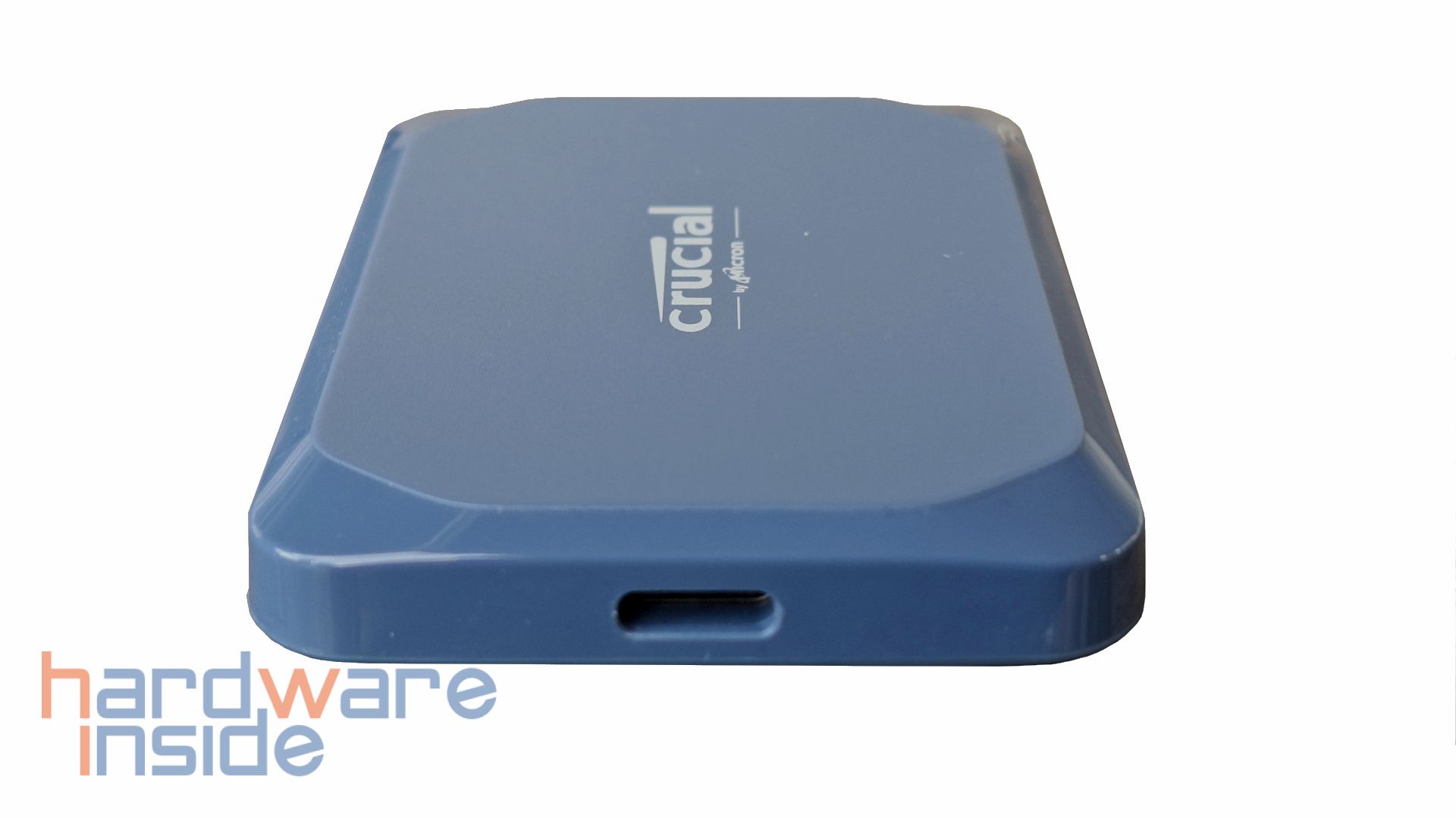 Die Crucial X10 Portable SSD hat eine rechteckige Grundform in dunkelblauer Farbe. Die Plastikoberfläche fühlt sich glatt aber dennoch griffig an. Auf der Vorderseite ist mittig das Logo der Marke Crucial in Weiß aufgedruckt. Auf der Rückseite ist eine Aufschrift mit Speicherkapazität, außerdem der Name des Modells, sowie Entsorgungshinweise zu finden. Trotz der glatten Oberfläche bietet diese eine überraschend gute Rutschfestigkeit. In den Seitenflächen der rechten oberen Ecke sind zwei Löcher eingefräst, um das Einfädeln einer Aufhängemöglichkeit zu vereinfachen. Die Kanten der Crucial X10 Portable SSD sind abgeflacht und machen das ansonsten sehr schlichte Design optisch deutlich interessanter. Der USB-C-Anschluss befindet sich an der linken Seitenfläche. Eine Abdeckmöglichkeit für den verwundbaren Anschluss gibt es leider nicht.