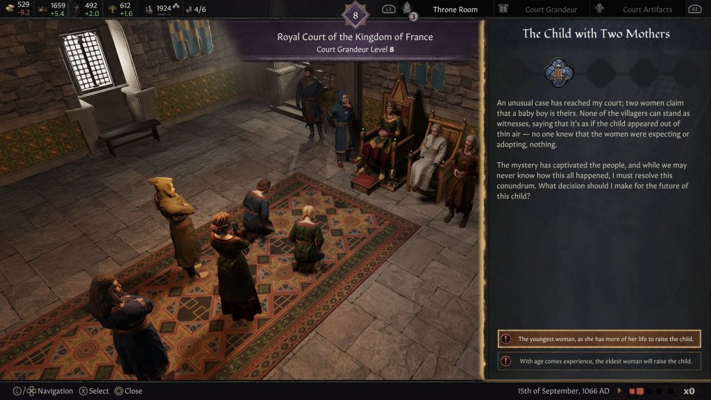 - Hof halten: Spieler interagieren mit Vasallen und Höflingen, wenn sie mit ihren Problemen zu ihnen kommen und ein königliches Urteil erbitten.