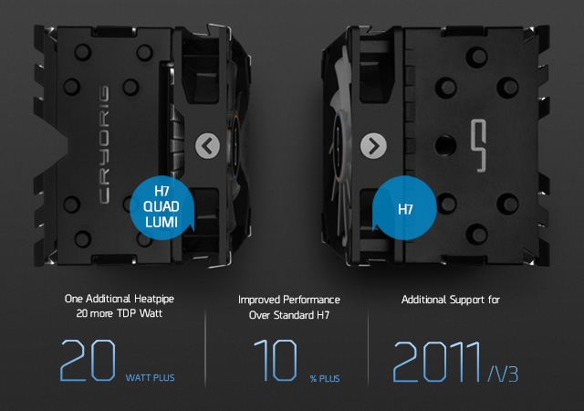 In seiner Grundform basiert der H7 Quad Lumi auf dem erfolgreichen CRYORIG H7 CPU-Kühler. Es gibt jedoch signifikante Unterschiede und diese liegen nicht nur in der Integration des Lumi Beleuchtungssystems. Der H7 Quad Lumi ist mit einer weiteren, hochleistungsstarken Kupfer-Heatpipe ausgerüstet worden, wodurch es nun vier an der Zahl sind. Weiterhin kommt ein neuer QF120 LED Lüfter mit 1.600 U/Min und ein überarbeitetes Montagesystem zum Einsatz. Durch die Aufrüstung und neue Anordnung der Heatpipes, kann die Leistung des H7 Quad Lumi gegenüber dem normalen H7 um mindestens 15% gesteigert werden, wodurch nun Prozessoren mit mehr als 160 Watt TDP unterstützt werden. Das neue Quick Mount System ist außerdem mit dem Sockel LGA2011 v3, LGA115x und AMD™s AM4 Sockel kompatibel. Somit wird die Kompatibilität zu allen gängigen Sockeln von Intel™ und AMD™ geboten. Der mitgelieferte QF120 LED Lüfter kann per PWM in dem Drehzahlbereich von 300 bis 1.600 U/Min geregelt werden und bietet weiße LED-Beleuchtung. Zu den Features des QF120 LED zählen außerdem die integrierten Acoustic Absorber und das bewährte Quad Air Inlet™ System. CRYORIG’s QF120 Serie wird zeitnah auch entsprechende LED-Modelle aufweisen.