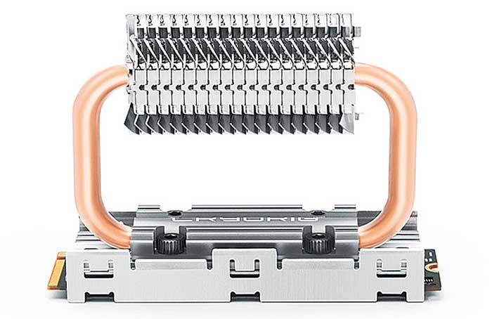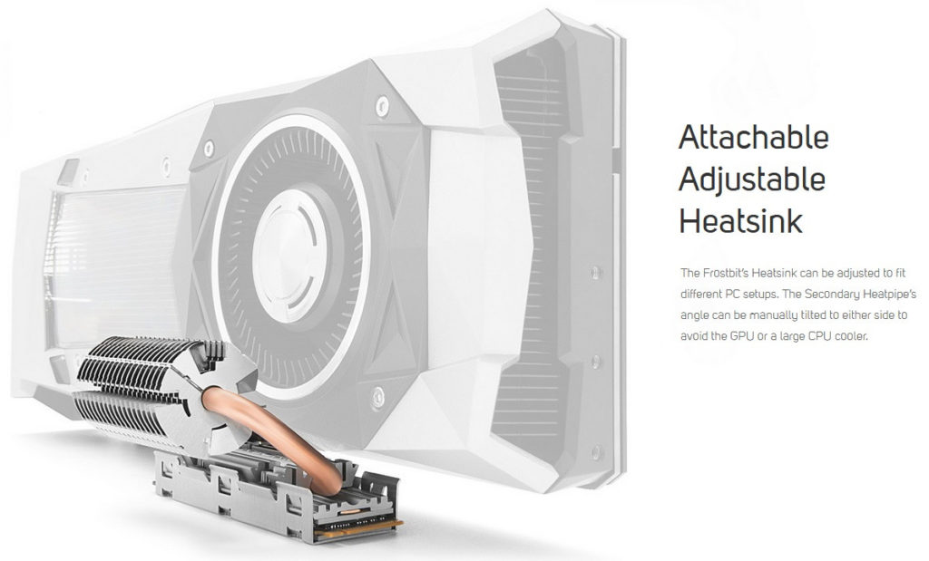 Der Frostbit ist der erste M.2 Kühler zum Nachrüsten, der die Heatpipe-Technologie konsequent umsetzt. Seine auf einander gestapelten Heatpipes arbeiten zusammenwirkend und formen dadurch eine massive Wärmeabgabefläche. Die erste Heatpipe ist mit einer Stärke von nur 1-Millimeter ultradünn und leitet die Abwärme der Komponenten zum primären Heat-Spreader. Die sekundäre Heatpipe setzt hier an und leitet die Abwärme an den großen Kühlkörper weiter. Der Kühlkörper des Frostbit kann flexibel ausgerichtet werden, um in jede PC-Konfiguration zu passen. Dabei hat man die Möglichkeit den Winkel der sekundären Heatpipe per Hand in eine der beiden Richtungen zu verändern, um Kollisionen mit der Grafikkarte oder einem großen CPU-Kühler zu vermeiden.