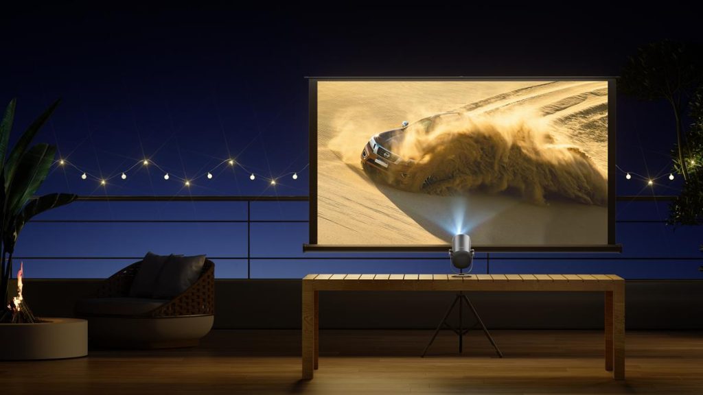 Der Freedo lässt sich mühelos im Innen- und Außenbereich einsetzen und bietet flexible Projektionsoptionen für kleine und große Flächen. Ein scharfes und perfekt ausgerichtetes Bild in einer Größe von 40- bis 180-Zoll ist so im Handumdrehen möglich. Der integrierte Standfuß mit einem Neigungswinkel von 165 Grad ermöglicht außerdem eine einfache Anpassung der Projektionshöhe bis zur Decke.