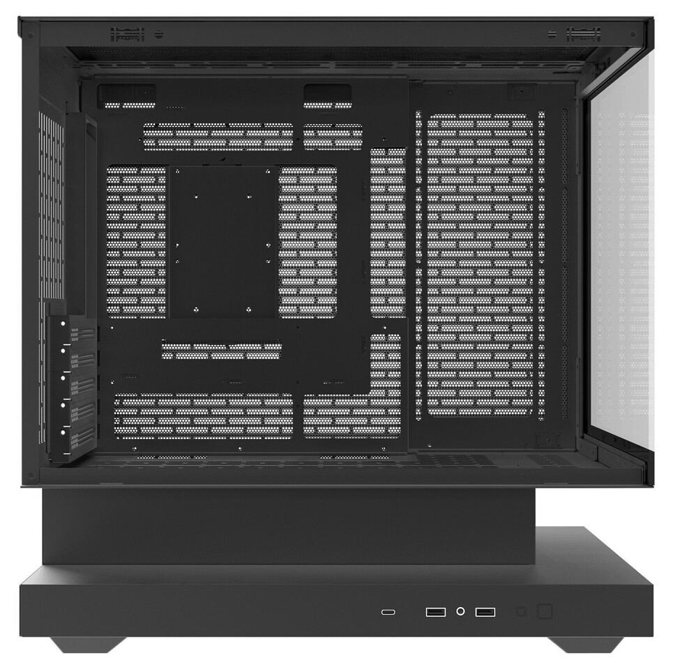 Ein weiteres Highlight ist das seitliche Klapp-Panel im Muschelschalen-Design, das ganz ohne Schrauben und Werkzeug geöffnet werden kann. Die schwebende Basis steigert nicht nur den Luftstrom rund um die Grafikkarte – laut Hersteller lassen sich die Temperaturen dadurch um 5–7 °C senken – sondern dient zugleich als Präsentationsfläche für individuelle Beleuchtung oder Dekoration.