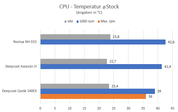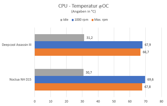 Doch wir wollen die Grenzen der beiden Kühler-Giganten miteinander vergleichen. Der Noctua NH D15 liegt nur knapp hinter dem neuen König im Luftkühlerbereich. Die Wärme wird auch über 30 Minuten Stresstest bei gleichen Gehäuse Bedingungen erfolgreich konstant abgeführt. Bitte beachten, die Lüfter des Noctua NH D15 arbeiten mit 1500 Umdrehungen und die des Deepcool Assassin III mit 1400 Umdrehungen.