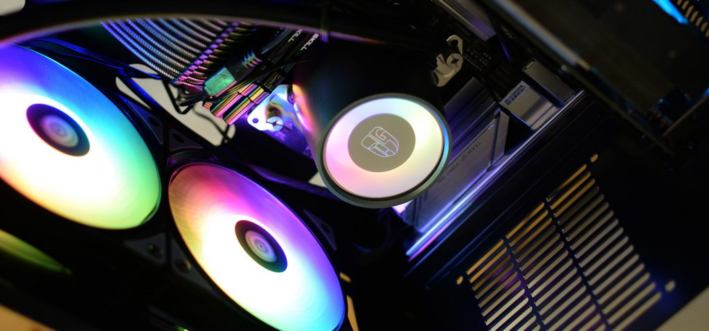Die schönen RGB-Effekte lassen die Castle 240RGB V2 glänzen. Durch die 5 Volt adressierbaren LEDs können wir die Effekte perfektionieren. Der Effekt des Blaulichts kommt elegant und kräftig zur Geltung. Die RGB-LEDs sitzen in der Nabe der 120 mm Lüfter. Die Pumpe binden wir mit einem 3-Pin Kabel an unseren spannungsregulierten Lüfter-Header am Mainboard an und regulieren die Geschwindigkeit auf das Maximum.