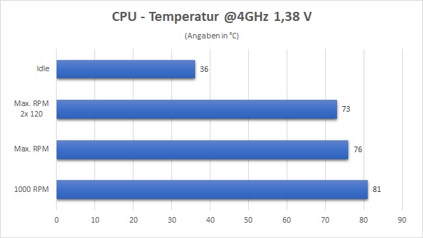 Die Temperatur bei 4 GHz hält sich in Grenzen. Die Spitzentemperaturen wurden nur kurzfristig erreicht, aber auch die Durchschnittstemperaturen der Kerne lagen immer über 75°C bei 1000 Umdrehungen. Die Lautstärke lag dafür aber bei 23,6 dB(A). Getestet wurde der Deepcool Gammaxx GT mit der aktuellsten AIDA Engineer Version über 30 Minuten. Die Temperaturspitze wurde schnell erreicht und veränderte sich 20 Minuten lang nicht. Das System wurde durch 2x 120 mm Lüfter mit 500 Umdrehungen mit Frischluft versorgt. Mit einem zweiten 120 mm Lüfter und einer maximalen Leistung von 1500 erreichten wir 76 bzw. 73°C. Keinesfalls ein schlechtes Szenario, da sich die Lautstärke weiterhin in einem akzeptablen Bereich befand. Mit einem 120 mm Lüfter bei 32,7 dB(A) und bei 34,2 dB(A) mit zwei Lüftern. Der Luftstrom und seine Lautstärke verändert sich natürlich leicht, wenn ein anderes Gehäuse oder andere Lüfter benutzt werden.