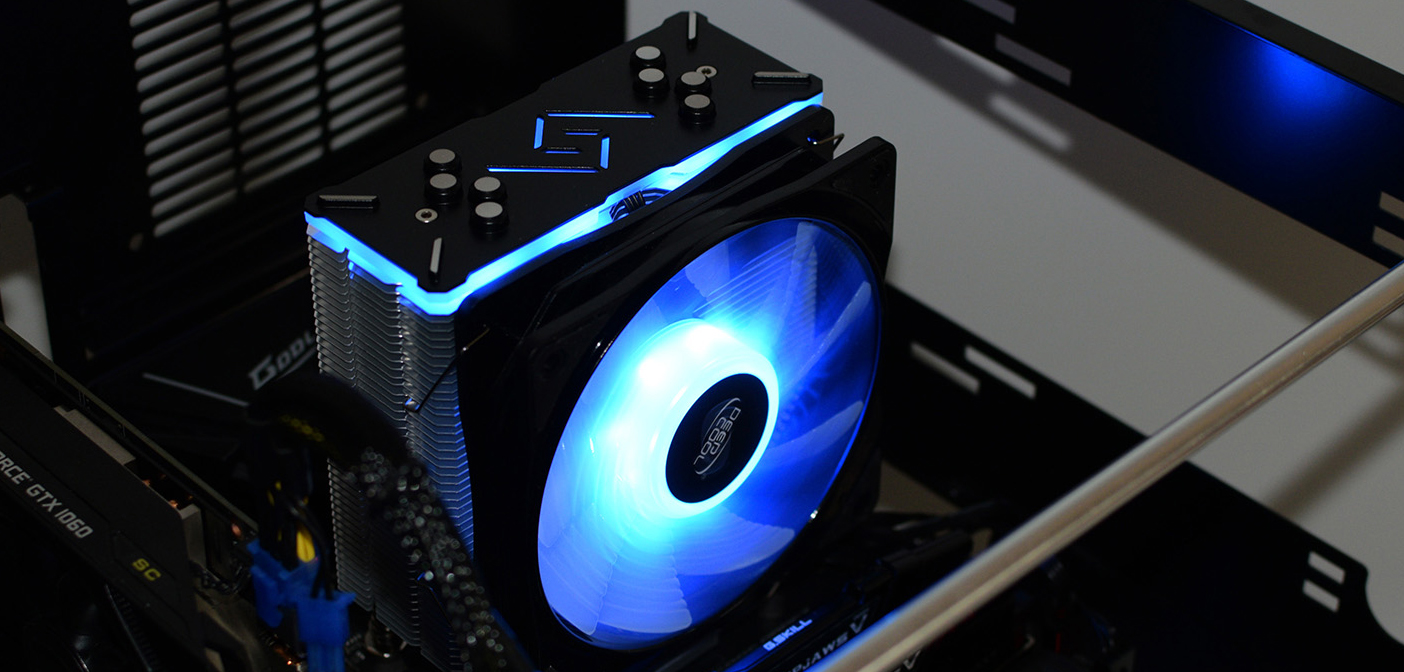 Der mitgelieferte 120 mm Lüfter versorgt den Deepcool Gammaxx GT mit kühler Luft. Seine Ecken sind mit einem dämpfenden Gummi versehen. Dies reduziert die Weitergabe der Schwingungen an den Kühler. Wie auch die Beleuchtung des Deepcool Gammaxx GT selbst, wird der DF120S mit einem 4-Pin RGB-Kabel angeschlossen. Um den 120 mm Lüfter in Betrieb zu nehmen, muss er mit einem 4-Pin PWM Port verbunden werden. Die Dynamik von 500 bis 1500 Umdrehungen ermöglicht einen Performance und Silent-Betrieb.