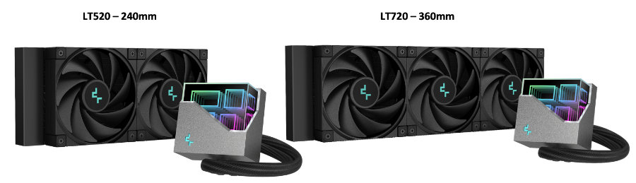 Die LT520 und LT720 verfügen über ein einzigartiges mehrdimensionales Pumpendesign mit leuchtender A-RGB-Beleuchtung, leistungsstarken FK120-Lüftern und DeepCools neuer Wasserpumpe der 4. Generation.