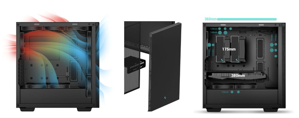 Das CH510 maximiert das Potenzial für flexible Konfigurationen, die den Anforderungen jeder Systemkonfiguration gerecht werden. Es bietet Unterstützung für große Grafikkarten mit einer Länge von bis zu 380 mm und große Luftkühler mit einer Höhe von bis zu 175 mm. Das Seitenteil aus gehärtetem Glas verwendet das magnetische Montagesystem von DeepCool, das ein optionales Sicherheitsschloss für zusätzliche Sicherheit beinhaltet. Das CH510 verfügt über eine eingebaute, verstellbare Grafikkartenhalterung, die verhindert, dass die Grafikkarte durchhängt. Außerdem gibt es noch einen ausziehbaren Kopfhörerhalter, der für einen ordentlichen Arbeitsbereich sorgt.
