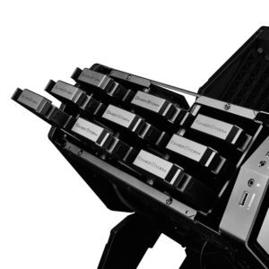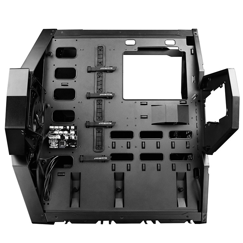 Neben der Unterstützung eines E-ATX-Mainboards verfügt der QUADSTELLAR über ein unabhängiges Grafikkartenfach, das bis zu drei Grafikkarten in SLI- oder CrossFire-Konfigurationen unterstützt. Ein weiteres Fach ist mit acht 3,5-Zoll- und zwei 2,5-Zoll-Laufwerkschächten (mit zusätzlichen 3 x 2,5-Zoll-Schächten im Gehäuse) ausgestattet und bietet eine riesige Speicherkapazität für Spiele oder Daten. Das Netzteil ist in einer eigenen separaten Zone untergebracht.