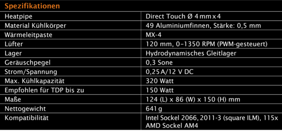 Er ist mit einem 120 mm Lüfter und einer ausgeklügelten Lüftersteuerung ausgestattet, die passives Kühlen der CPU bei einfachen Anwendungen möglich macht. Wird eine höhere Kühlleistung für das Gaming benötigt, setzt der F12 PWM Lüfter bei einem PWM Signal mit 40 % Pulsbreite ein. Das spart Energie, verlängert die Lebensdauer, macht den Kühler bei niedriger Last absolut geräuschlos und liefert zugleich höchste Leistung für das Gaming.