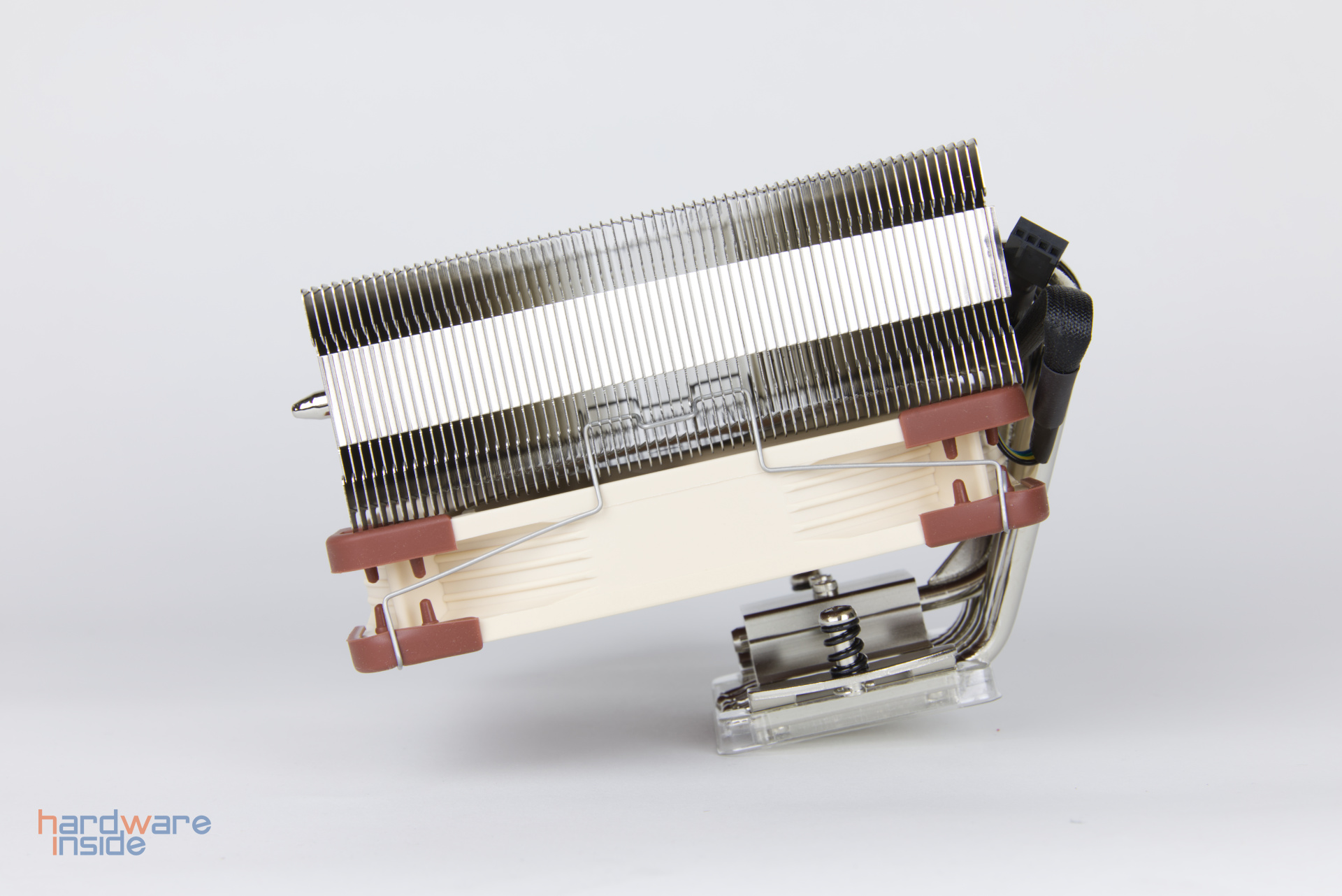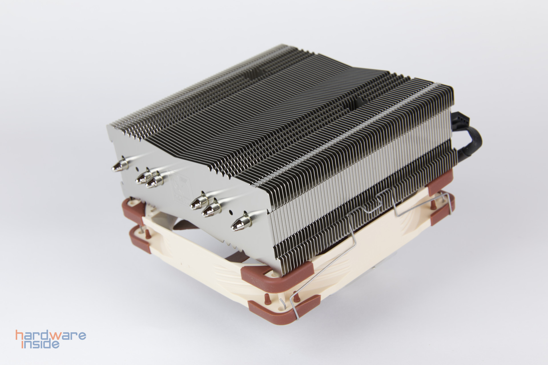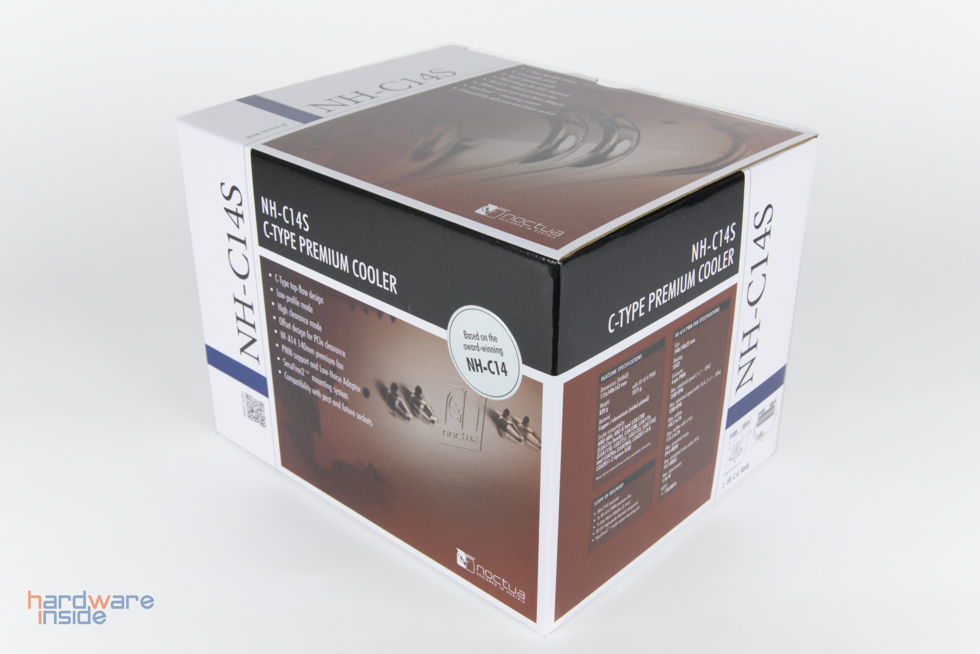 Mitgeliefert wird der Noctua NF-A14, welcher zwischen 300 und 1500 rpm geregelt werden kann. Wird der Lüfter auf dem Kühler montiert, kann Arbeitsspeicher mit einer Gesamthöhe von bis zu 70 mm verbaut werden. Wird er darunter montiert, bietet er sich für viele kleinere HTPC-Gehäuse an.