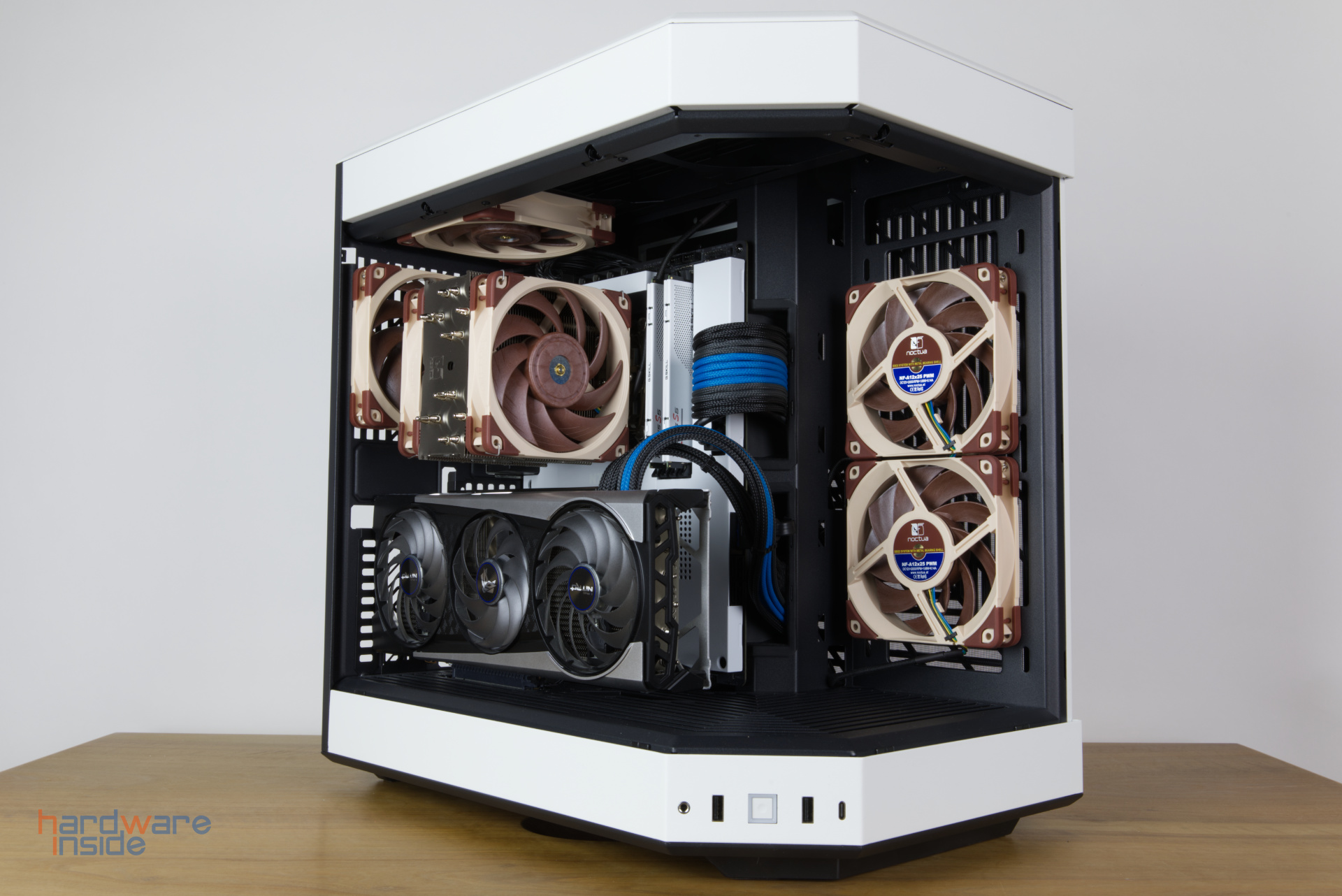 Als Wärmeleitpaste haben wir uns für die Thermal Grizzly Kryonaut entschieden, welche immer exakt gleich aufgetragen wird. Im hier eingesetzten Hyte Y60 werden alle Lüfter durch Noctua NF-A12x25 PWM ersetzt und auf 1000 rpm mithilfe der Aqua Computer OCTO Lüftersteuerung fixiert. Die Lüfter der Grafikkarte werden vollständig abgeschaltet. Für die Messung des passiven Noctua NH-P1 wurden die Gehäuselüfter im semi-passiven Betrieb auf 1000 rpm gestellt und für die Messung des passiven Einsatzes abgeschaltet.