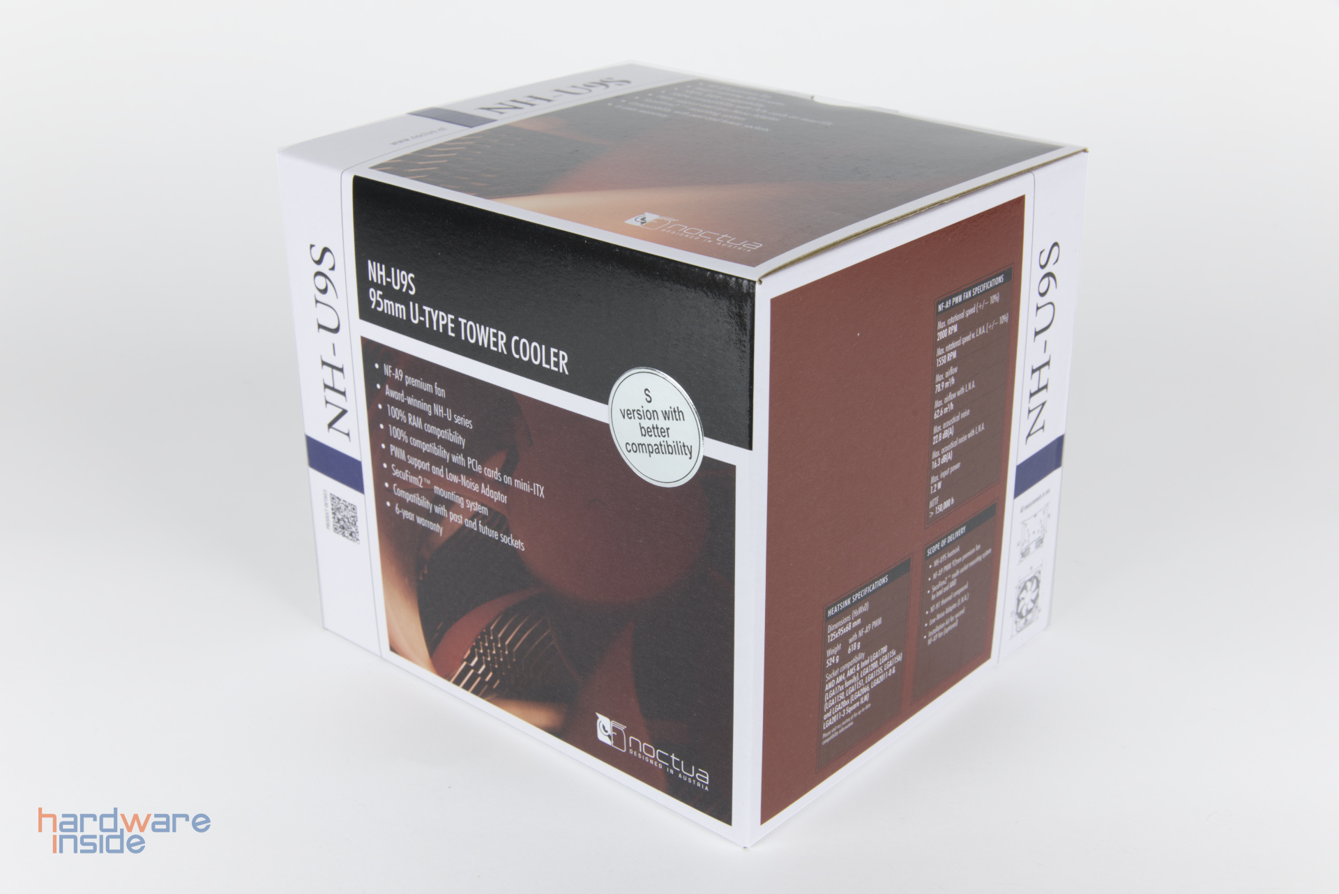 Der Noctua NH-U9S ist wahrlich ein Zwerg, der mit einer Größe von 95 x 95 x 125 mm (L x B x H) und seinem 92 mm Lüfter wirklich flexibel verbaut werden kann. Auch das Gewicht mit Lüfter von 618 Gramm kann als handlich beschrieben werden.