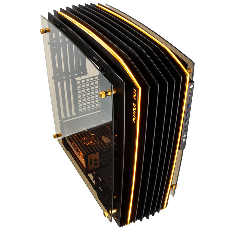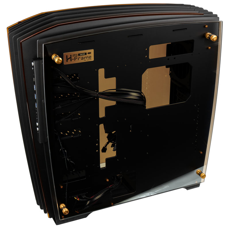 Das Besondere am IN WIN H-Frame 2.0 ist die extravagante Optik, die vor allem bei den Signature-Gehäusen des Herstellers immer wieder für Aufsehen sorgen. Das Gehäuse im Big-Tower-Format basiert auf dem bekannten Vorgänger H-Frame und wurde zum 30. Jubiläum komplett überarbeitet und mit einigen Verbesserungen ausgestattet. Das edle Design ist nun trotz der neun schwarzen Aluminiumlamellen ein gutes Stück schlanker und dank der getönten Hartglas-Seitenscheiben wesentlich luxuriöser. Mit dem offenen Lamellen-Design, den hochwertigen Materialien und der herausragenden Verarbeitung übertrifft sich IN WIN mal wieder selbst und ergänzt das edle Design-Gehäuse um eine stylische bernsteinfarbene LED-Beleuchtung in Form von zwei Streifen auf den Lamellen.