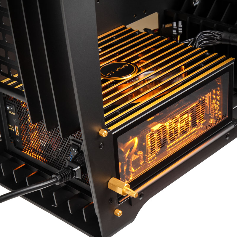 Als Jubiläums-Bonus stattet IN WIN den H-Frame 2.0 von Haus aus mit einem extrem leistungsstarken 1065-Watt-Netzteil aus, das mit einer Effizienz von ~92% und nützlichen Features aufwartet. Das vollständig modulare Netzteil verfügt als erstes Netzteil überhaupt über Seitenfenster aus 4 mm starkem Hartglas, welches innerhalb des Gehäuses für einen weiteren Eye-Catcher sorgt. Darüber hinaus ist es ebenfalls mit einer stylischen LED-Beleuchtung ausgestattet, welche sich an der Rückseite des Netzteil bei Bedarf auch ausschalten lässt. Der leise 165-mm-Lüfter lässt sich bei Bedarf auch nach dem Ausschalten des PCs in Betrieb halten und ein praktischer USB-Port mit Fast-Charge-Funktion ist ebenfalls mit von der Partie.