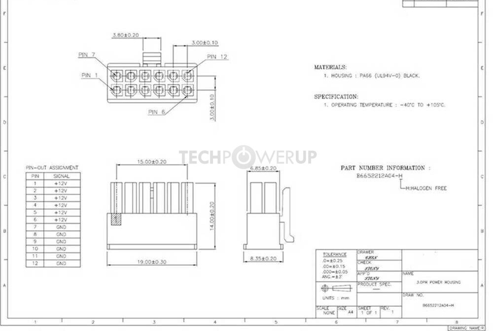 Wenn wir uns die Blaupause ansehen, sehen wir, dass es nicht möglich sein wird, zwei klassische 6-Pin-Steckverbinder daran anzuschließen. Zum Beispiel ist Pin 1 auf dem PCIe 6-Pin quadratisch, aber auf NVIDIAs 12-Pin ist eine Ecke abgewinkelt. Es wird auch nicht möglich sein, seltsame Kombinationen wie 8-polig + EPS 4-polig oder ähnliches zu verwenden – NVIDIA hat dafür gesorgt, dass die Leute ihre Kabel nicht verkehrt herum anschließen können.